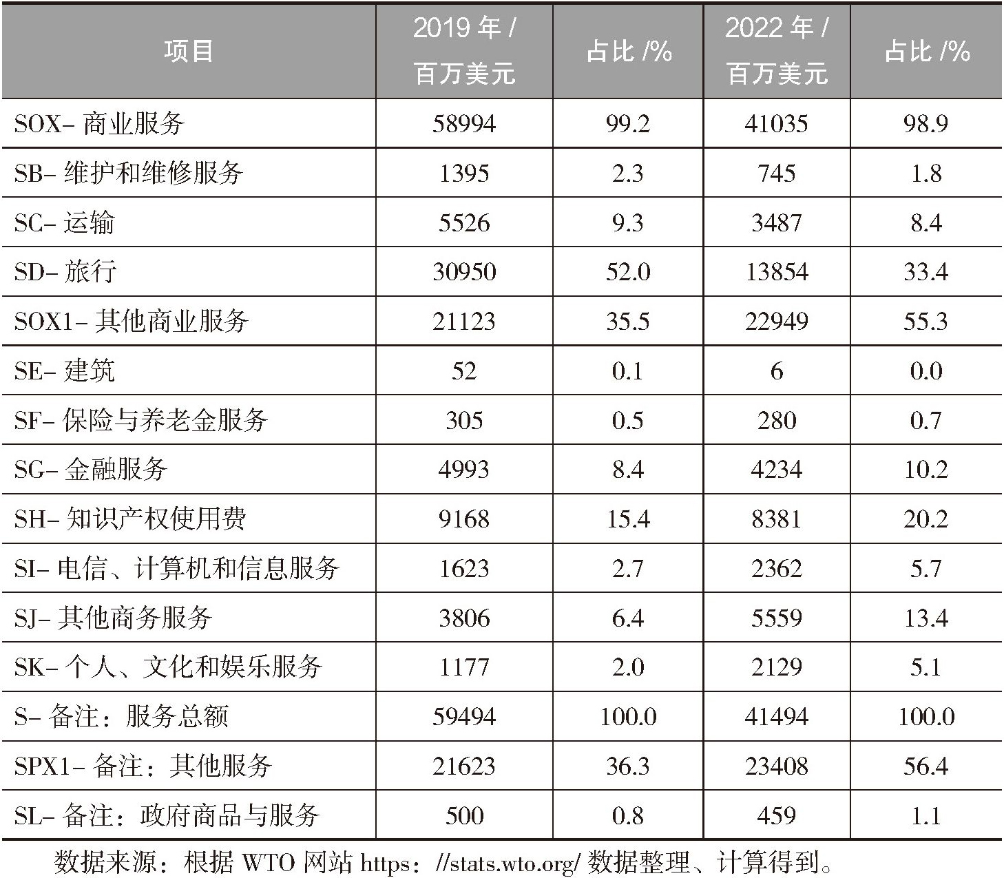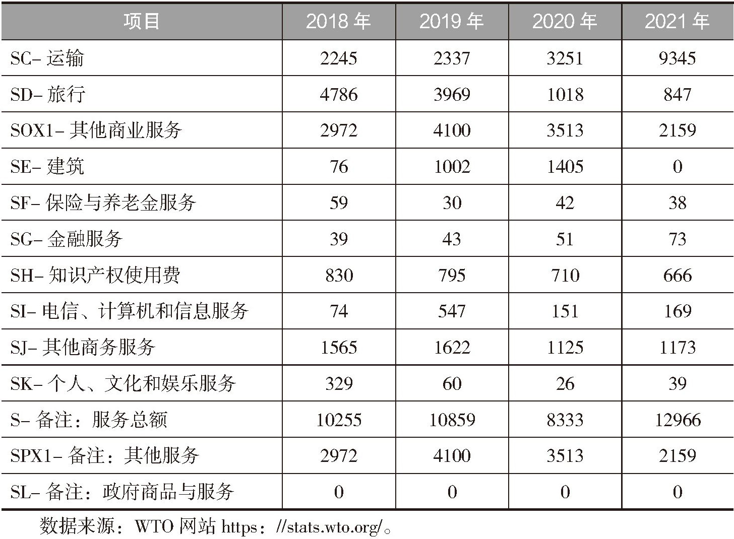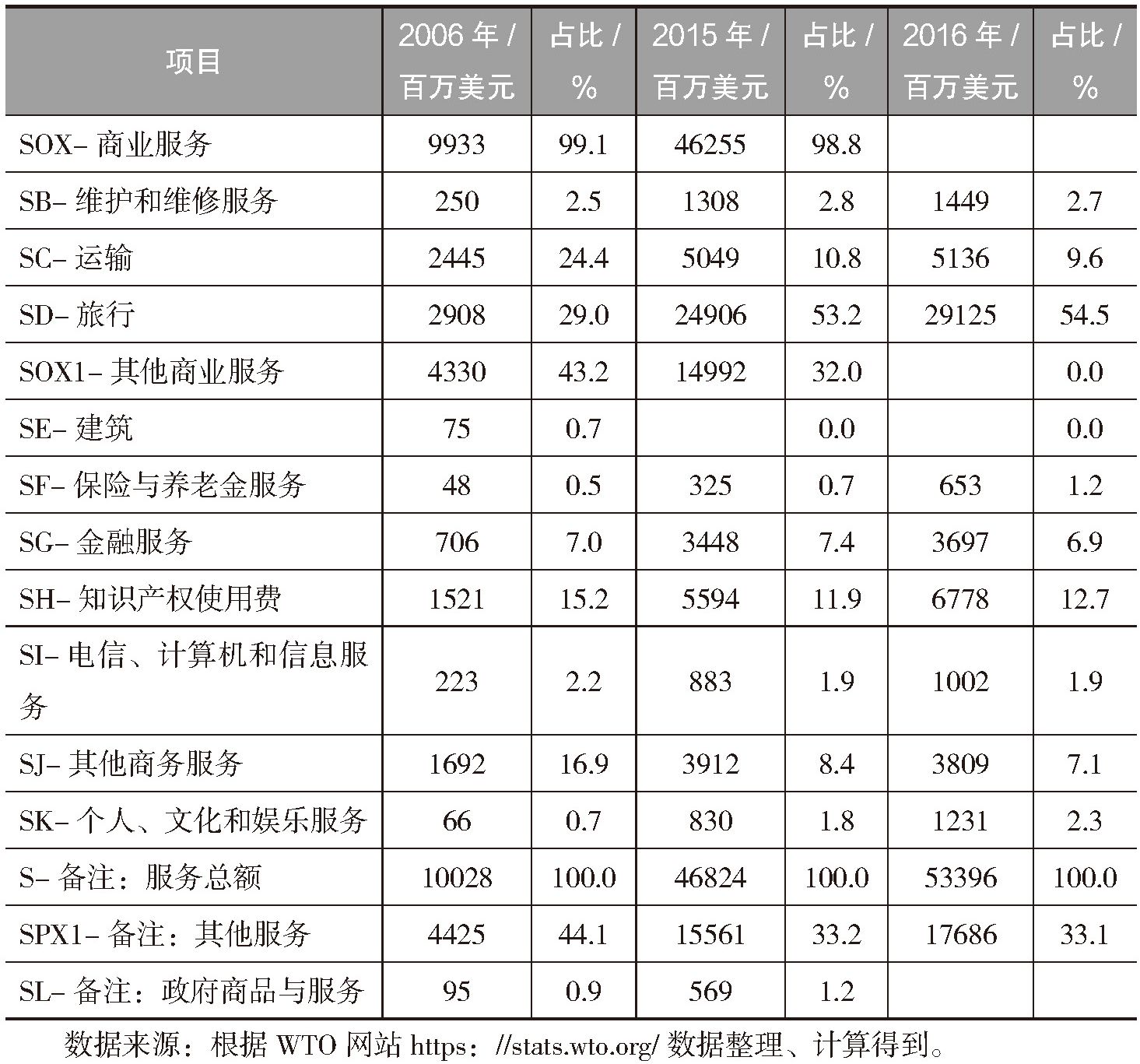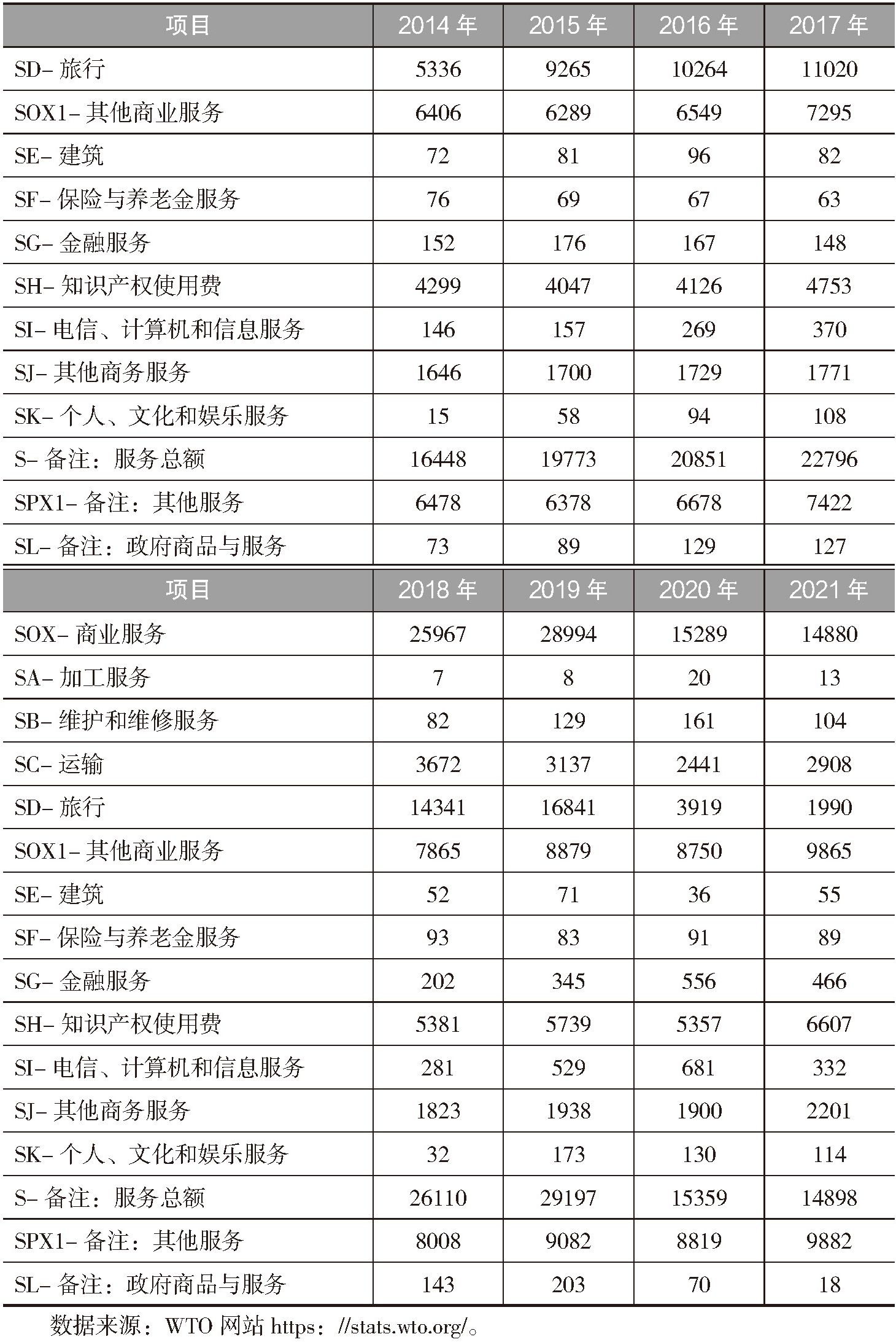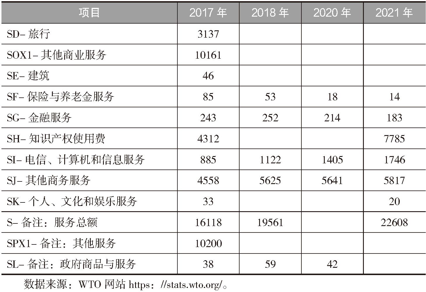 在选取国家时,一方面考虑的是该国的代表性,例如该国的经济比较发达,或人口比较多,或与我国有较多的贸易交往。在选取国家时还有一个重要考虑,就是数据的可获得性。例如,有的国家较为发达,与我国的服务贸易也较多,但是从WTO数据库里难以获得相应的数据。对于这种情况,可以考虑从别的途径获得相关数据。但是为了保持数据的可比性,本小节的所有数据均取自WTO数据库,不从别的途径获取。那么,如果WTO数据库里缺乏相应的数据,那么该国就不予考察了。
