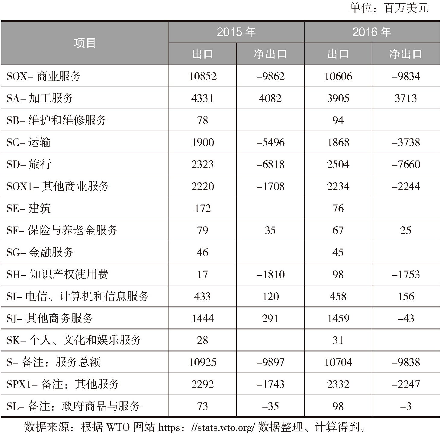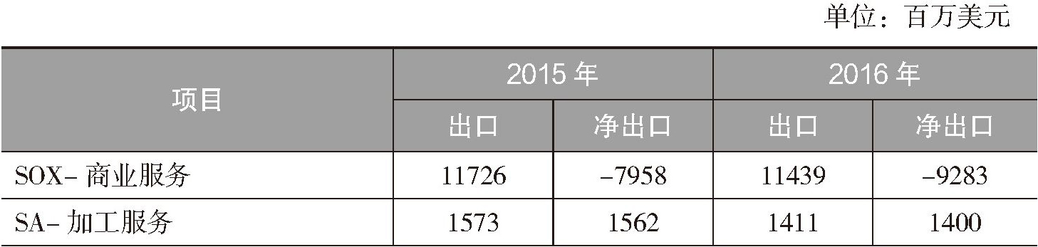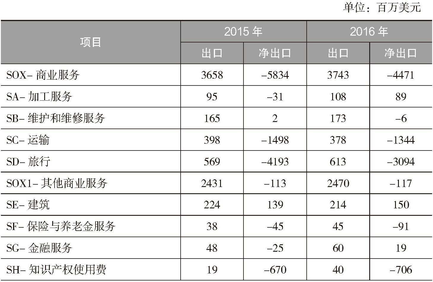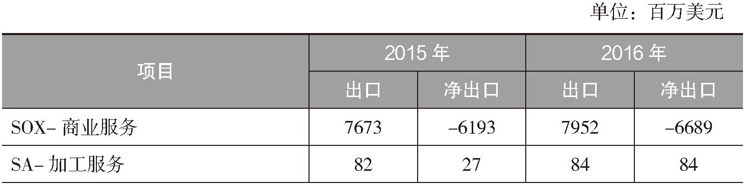 从表2-7可以看出,在2015年我国向日本出口服务的总额117.68亿美元中,SOX-商业服务占了绝大多数,为117.26亿美元,SL-政府商品与服务只有微小的0.42亿美元。