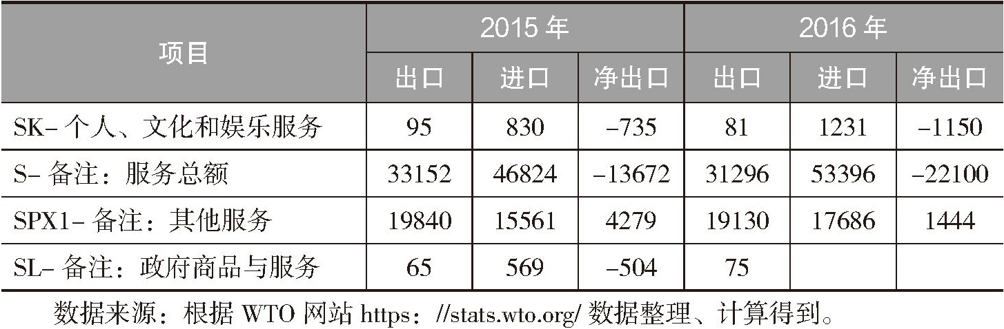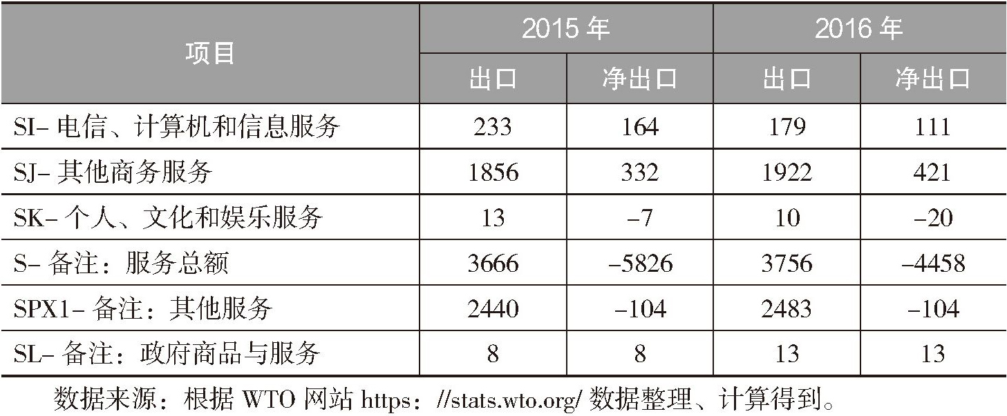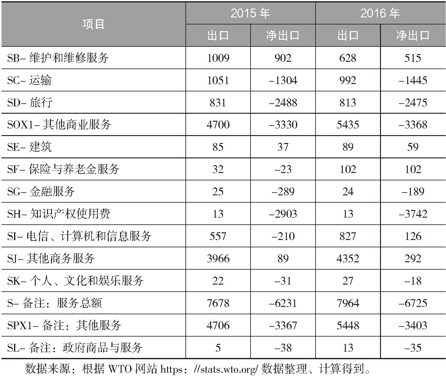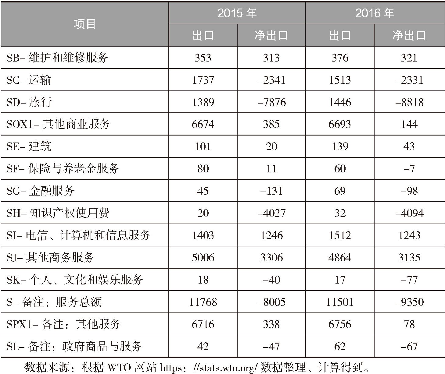 以上是从中国从美国进口服务的角度进行的简要分析,下面从相反的方向,即从中国向美国出口服务的角度进行分析。在WTO数据库中,近15年里只有2015年、2016年有我国向美国出口服务的数据,结合前面的进口数据,可以计算得到相应的净出口数据。具体如表2-5所示。