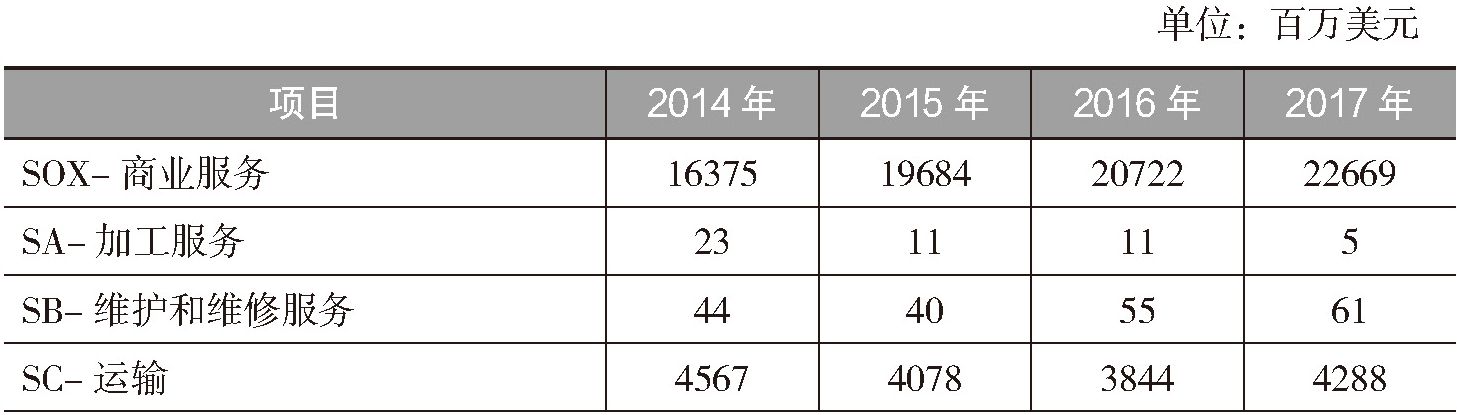 除了SOX1-其他商业服务,SOX-商业服务的大项主要有SB-维护和维修服务、SC-运输、SD-旅行,金额分别为10.09亿美元、10.51亿美元、8.31亿美元。