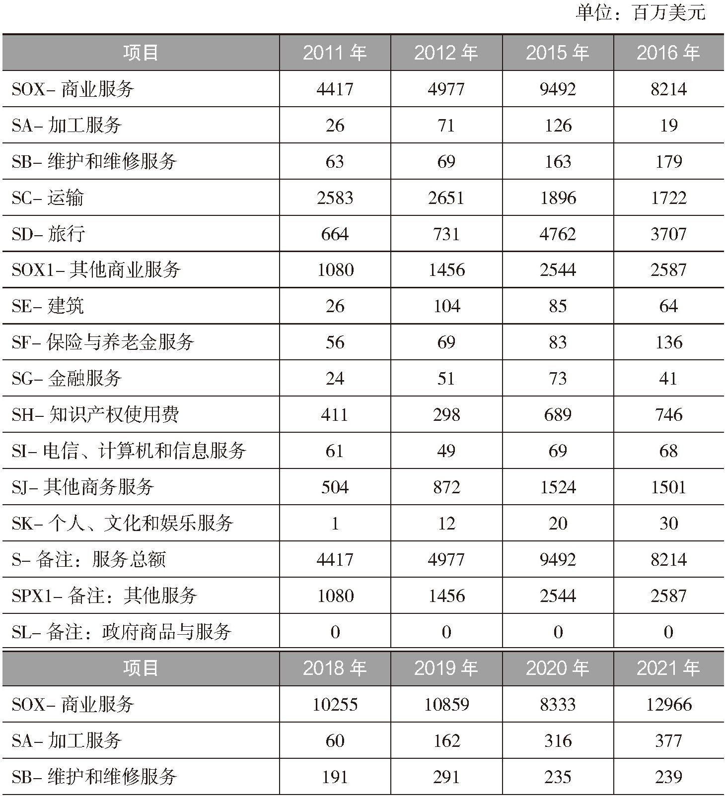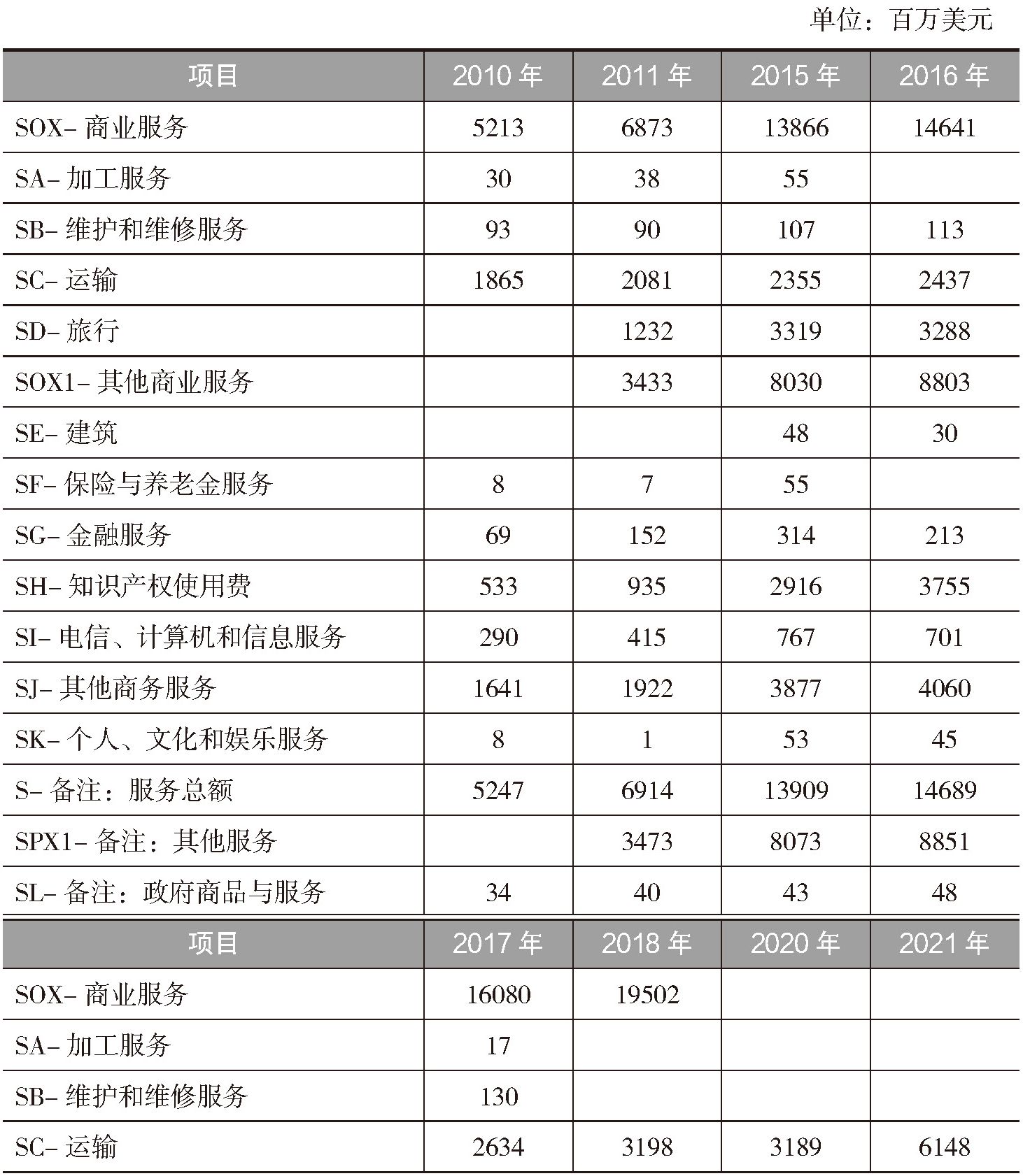 引人注目的是,从2018年起数据缺失严重(没有列出的2019年的数据缺失情况比其余年份更严重)。更引人注目的是,在2018年、2021年数据缺失严重的情况下,却存在S-服务总额的统计数据。此外,2010年缺乏SOX1-其他商业服务的统计数据。为了尽可能地保持数据的可比性,下文主要考察数据较为完整的2011年至2017年。