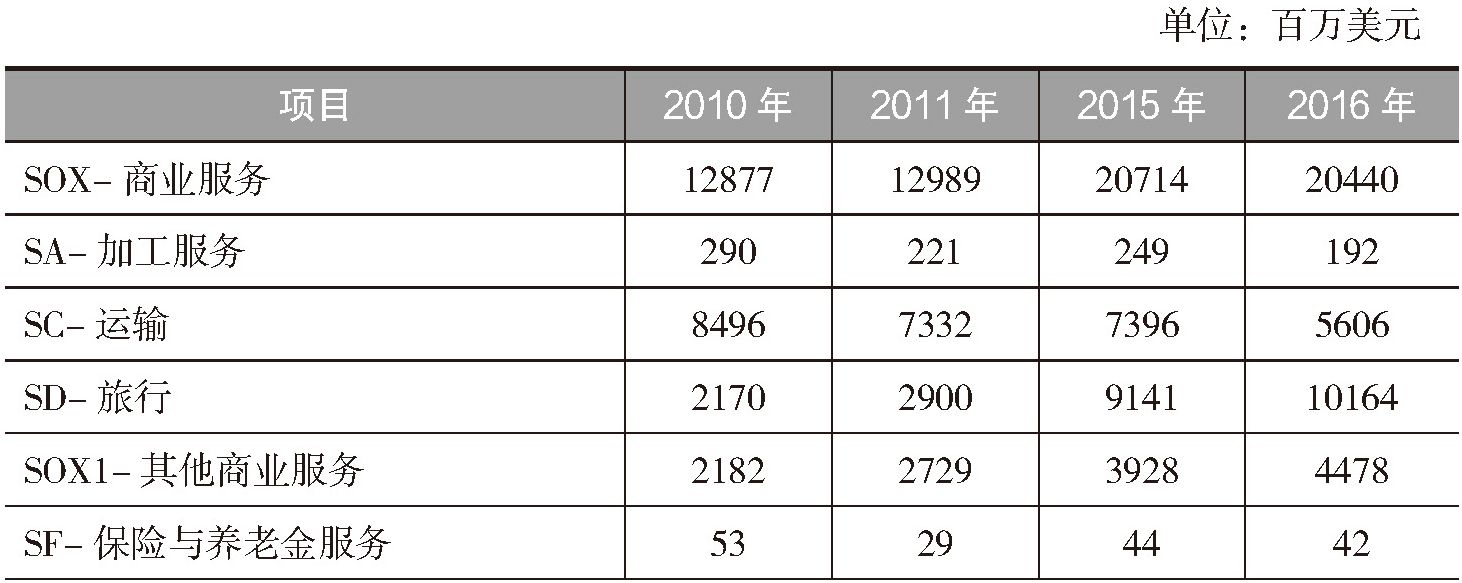 2015年S-服务总额为逆差,逆差额为98.97亿美元,几乎全部来自SOX-商业服务。具体来说,最主要的逆差来自SC-运输、SD-旅行,逆差额分别为54.96亿美元、68.18亿美元,分别占S-服务总额逆差的55.5%、68.9%。其次的逆差项为SH-知识产权使用费,逆差额为18.10亿美元,占S-服务总额逆差的18.3%。