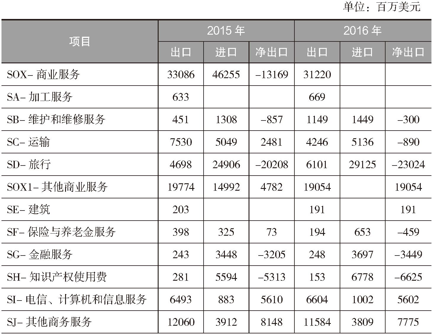 2016年S-服务总额的净出口与2015年几乎相同,但有些项目变动较大。其中,2016年SC-运输的净出口比2015年增加了17.58亿美元,主要是因为2016年SC-运输的进口比2015年减少了17.90亿美元。