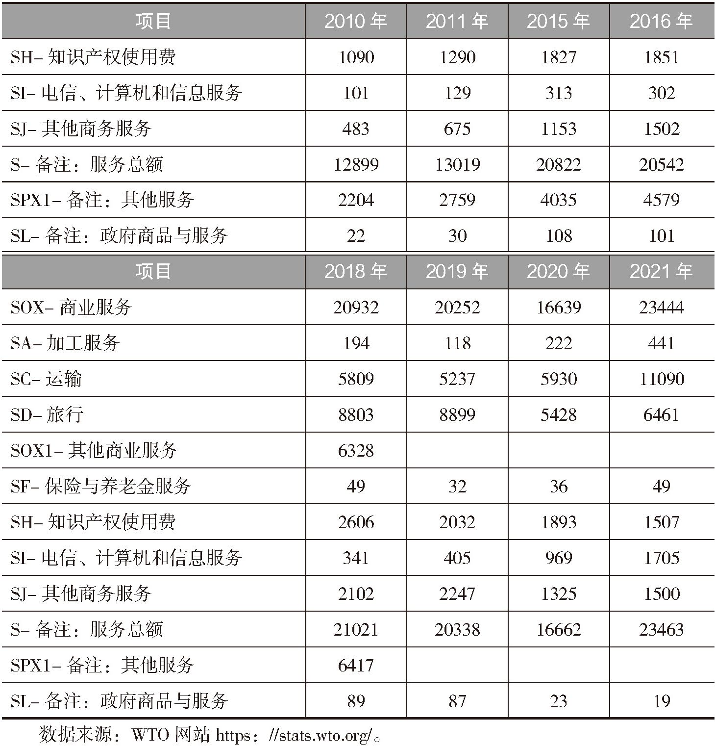 (1)WTO数据库里有2010年至2021年我国从韩国进口服务的统计,但是每年都有缺项,尤其是从2019年起缺项更为严重。为节省篇幅,下面只列出最早的2010年、2011年的统计,后面用来与中国向韩国出口服务相对比的2015年、2016年的统计,以及数据最新的2018年至2021年的统计。具体如表2-8所示。