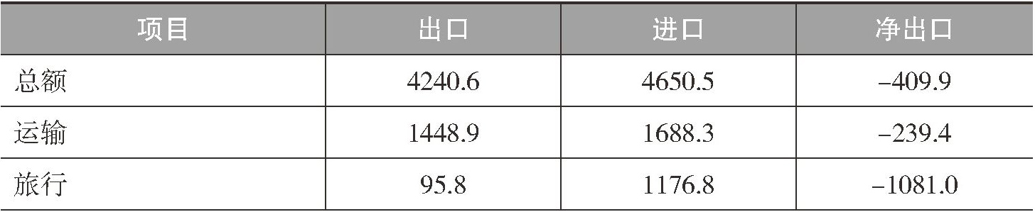 这种出口与进口在项目金额大小次序上的不同,在其后的项目中表现得更为明显。对于出口来说,继最大项运输,第二大项电信、计算机和信息服务之后,第三、第四、第五大项依次是建筑(282.3亿美元)、加工服务(208.7亿美元)、知识产权使用费(132.7亿美元)。而进口的第三、第四、第五大项依次是知识产权使用费(444.3亿美元),电信、计算机和信息服务(380.3亿美元),保险服务(208.8亿美元)。
