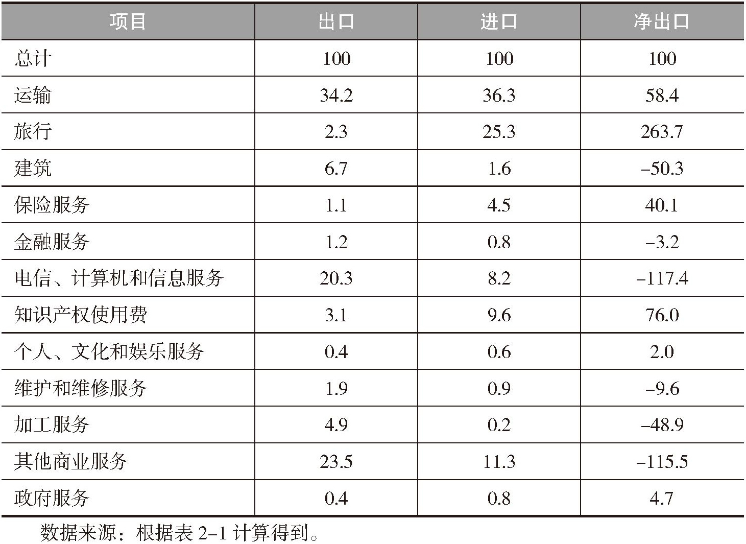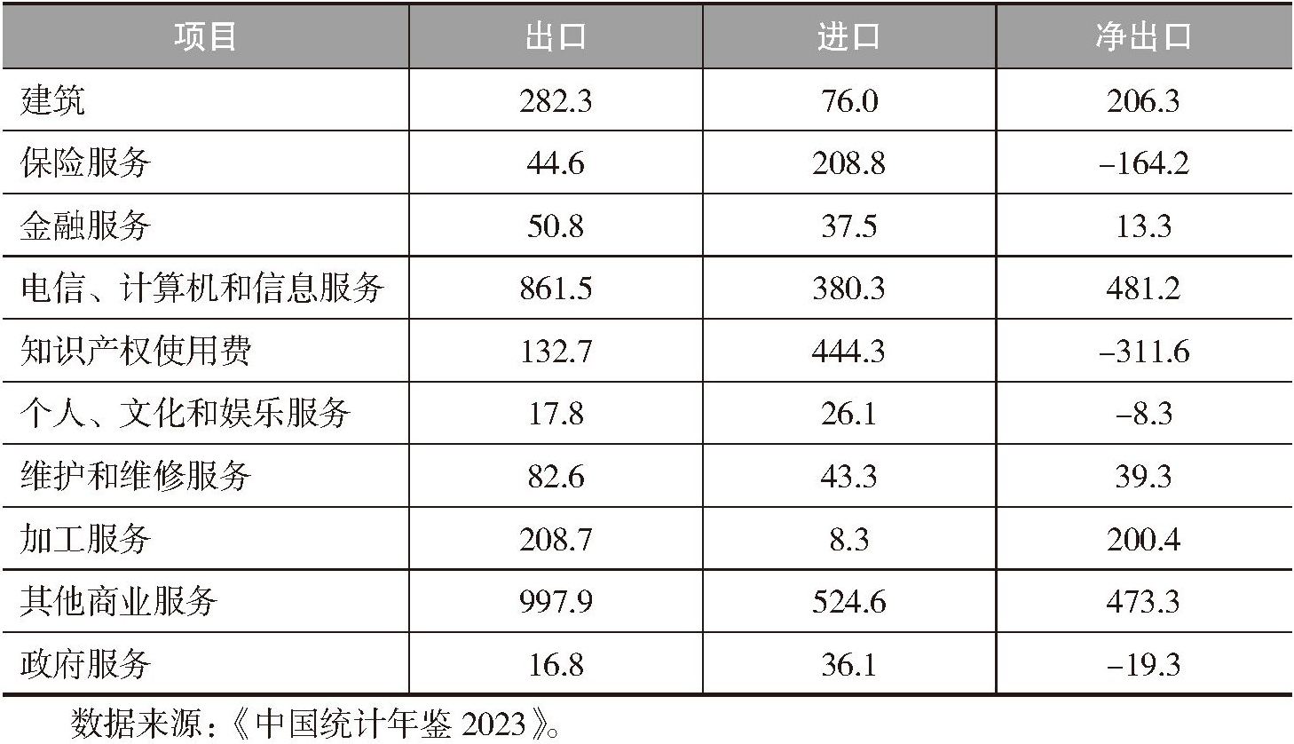 从表2-1可见,我国2022年服务进出口的最大项目是运输,该项既是出口的最大项,金额为1448.9亿美元,也是进口的最大项,金额为1688.3亿美元。
