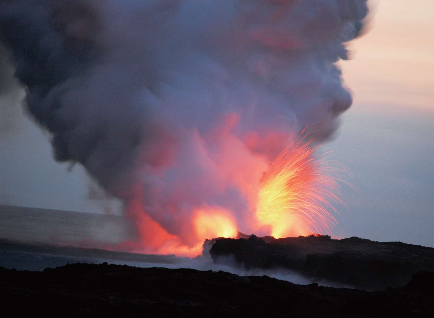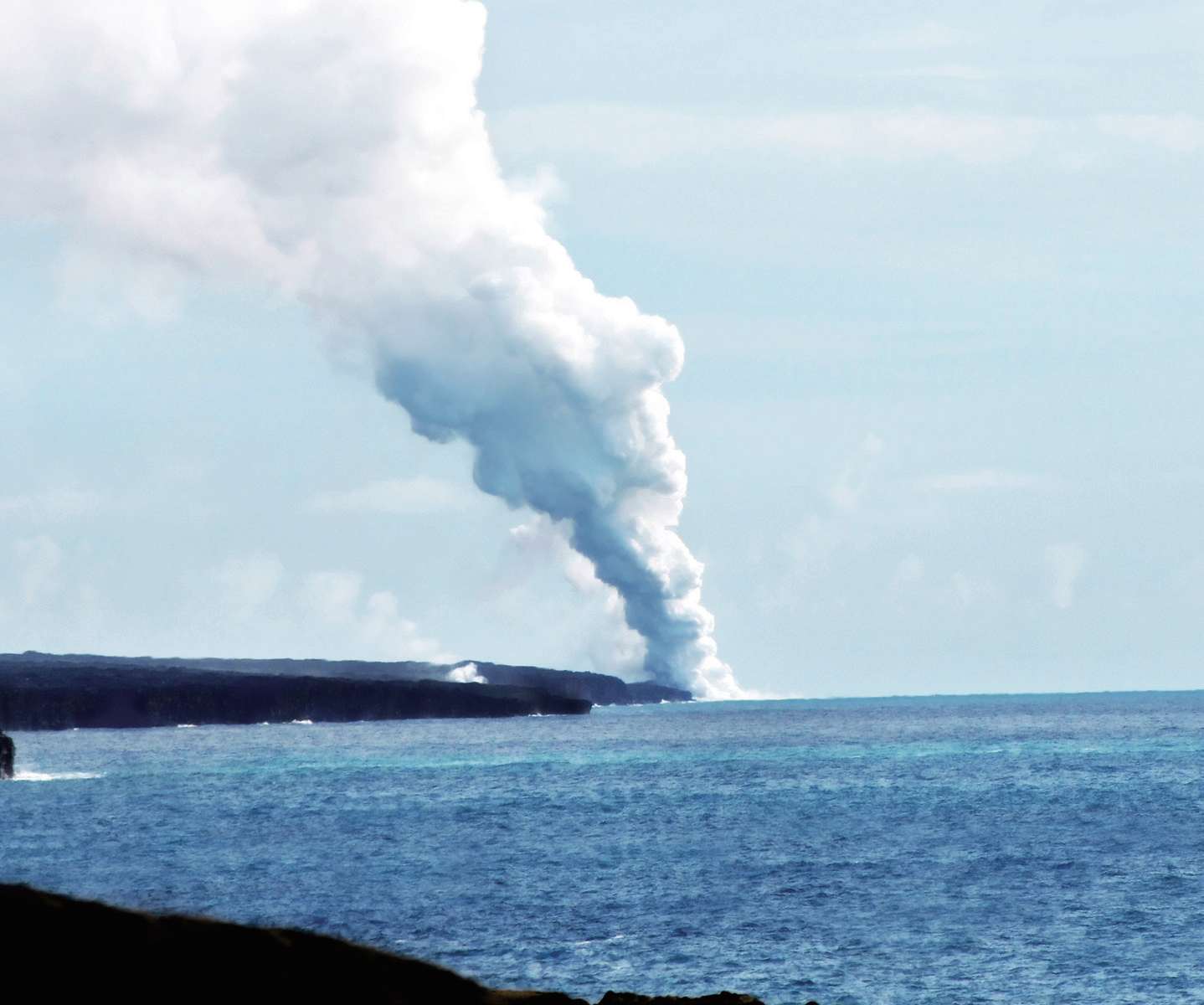 与日本附近的海底火山不同的是,夏威夷海底火山喷发是一种宁静式的,大量熔岩流从火山口流出,像一条火龙沿海底流动,沸腾的海水喷出一股股强劲的蒸汽柱。