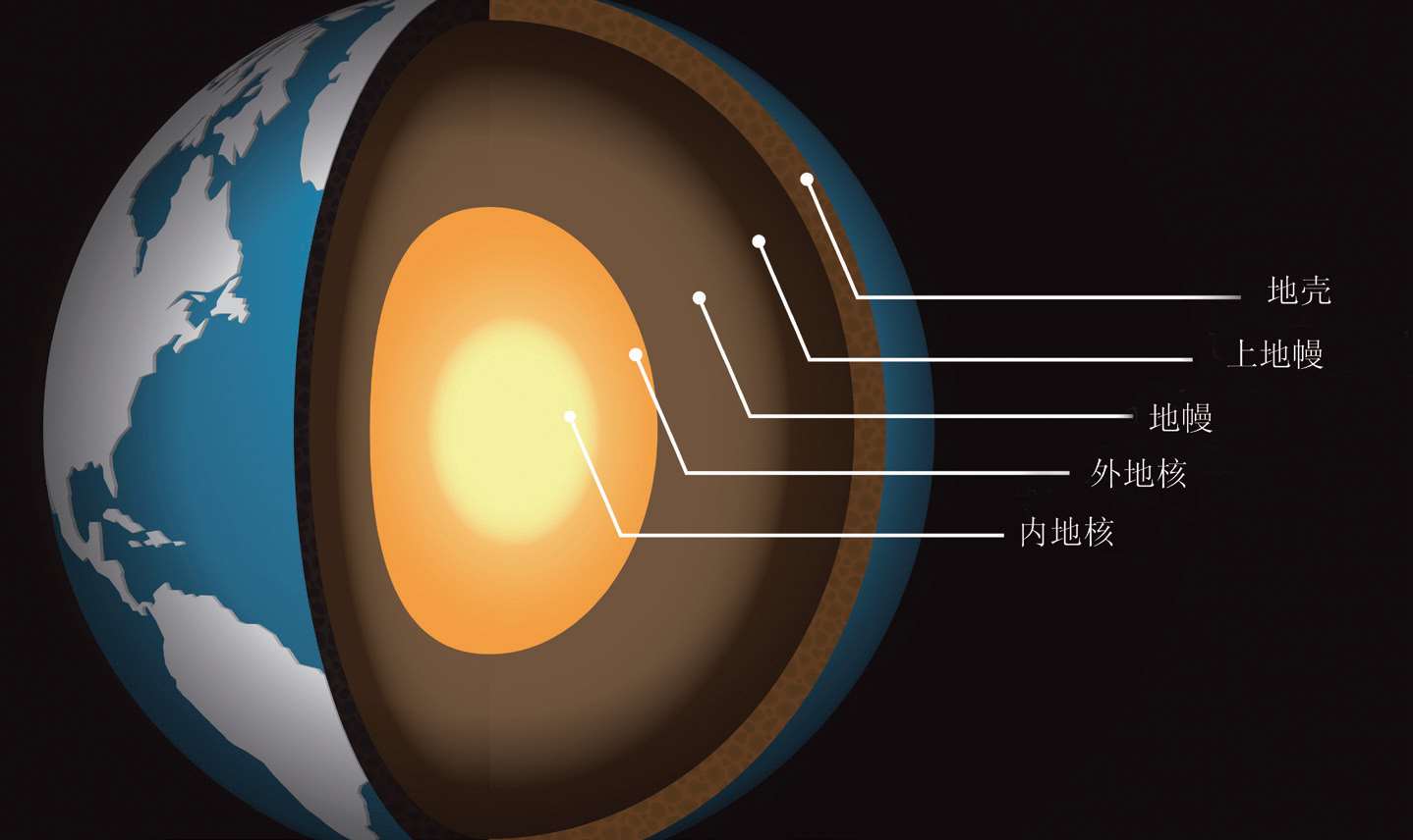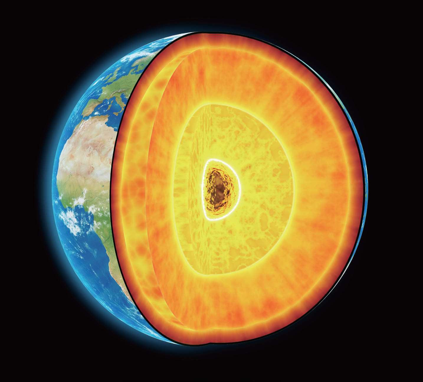 内地核位于地球的核心部分,呈球体状,距地表的深度为5155千米至6371千米。内核的深度位于5100千米以下,温度在4000摄氏度以上。