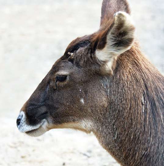 白唇鹿体形高大,头部似等腰三角形,额部宽平,耳朵长而尖,雄鹿有茸角。它的颈部很长,臀部有淡黄色块斑。最为主要的是,它鼻端两侧和下唇都是纯白色,因此称白唇鹿。
