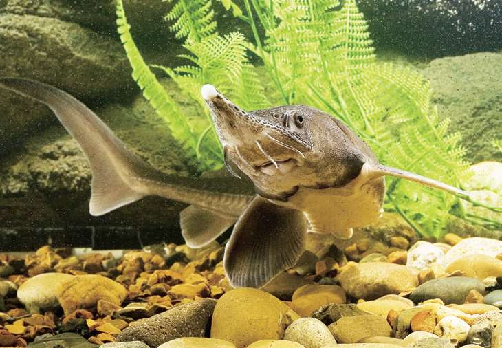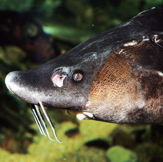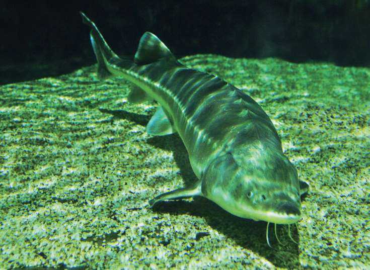 中华鲟身体呈纺锤形,头尖呈长三角形且吻长,口前有4条吻须,唇部不发达,有细小乳突。鼻孔大,眼小,体表有5行纵行排列骨板,背面一行,体侧和腹侧各两行,每行有棘状突起。