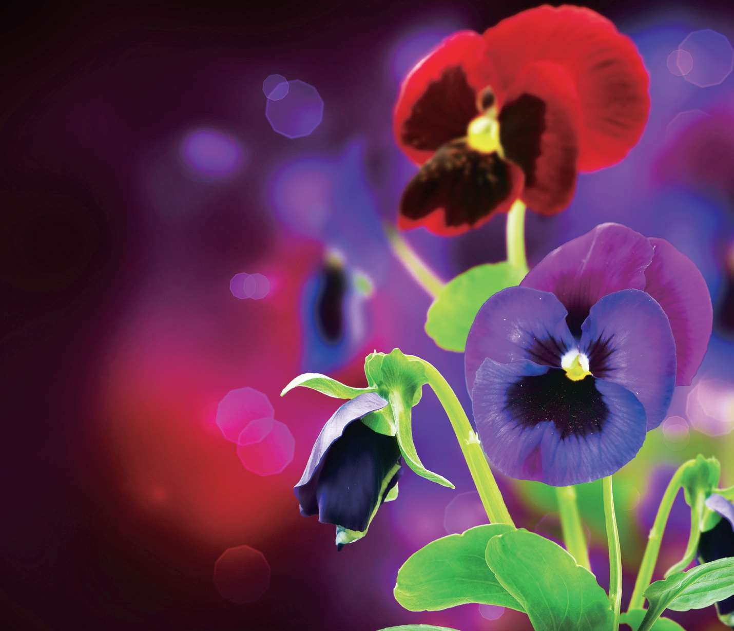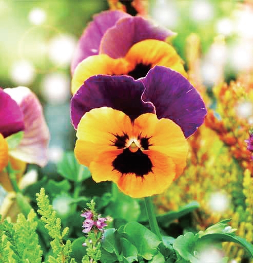 花茎由顶部或腋部抽出,集中在每年冬、春两季开花,每朵花有5瓣,颜色有白、黄、紫、蓝和红等多种颜色。由于花色深浅搭配,加上花瓣纹路变化,因此让人看起来有一种错觉,有时看似人面,有时又像猫脸,所以被人们称作“猫脸花”、“鬼面花”。三色堇花姿优雅,花色绚丽耀眼,具有层次感的花瓣宛若彩蝶,每当微风轻拂,常随风翩翩起舞,优美迷人。