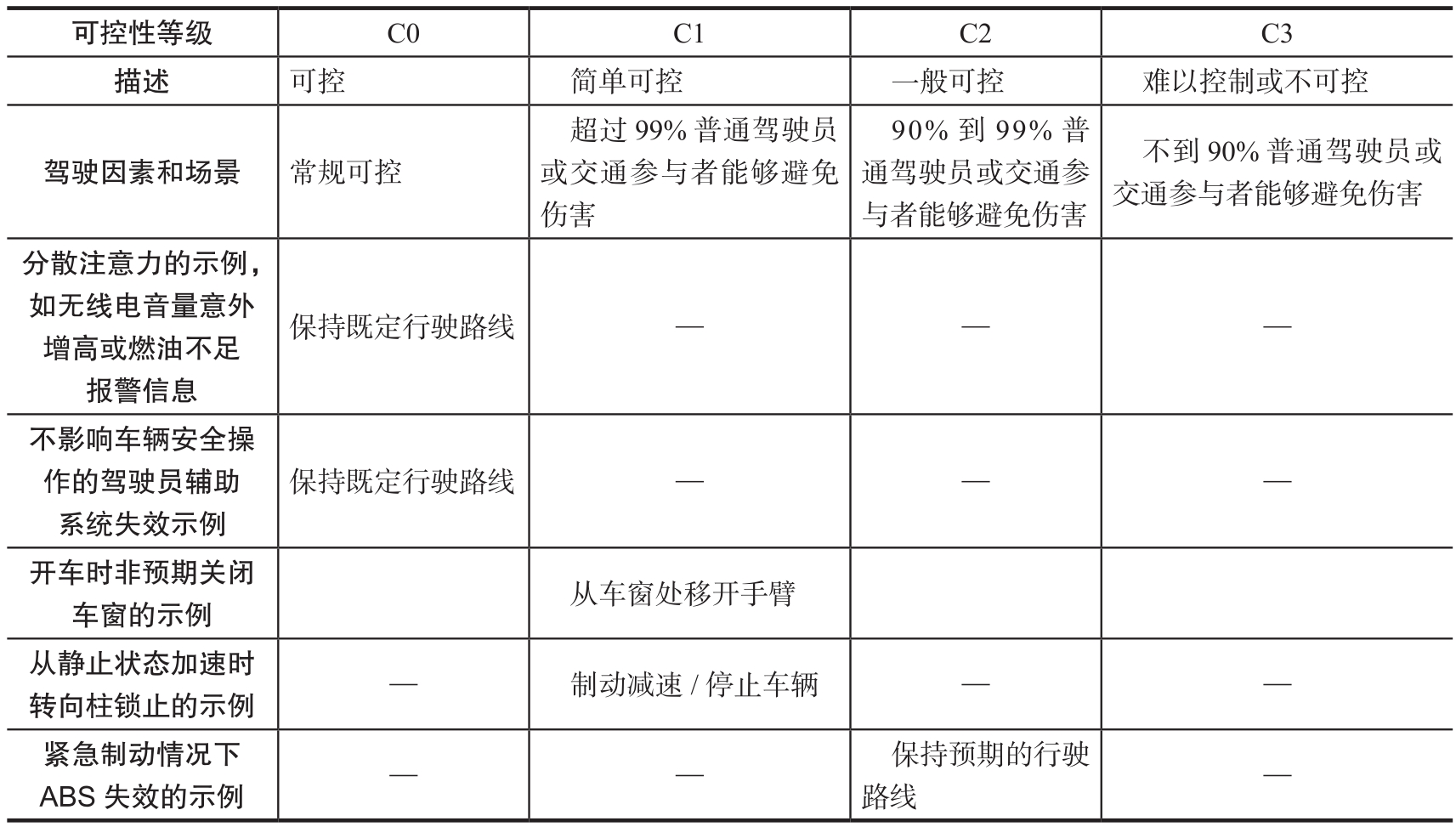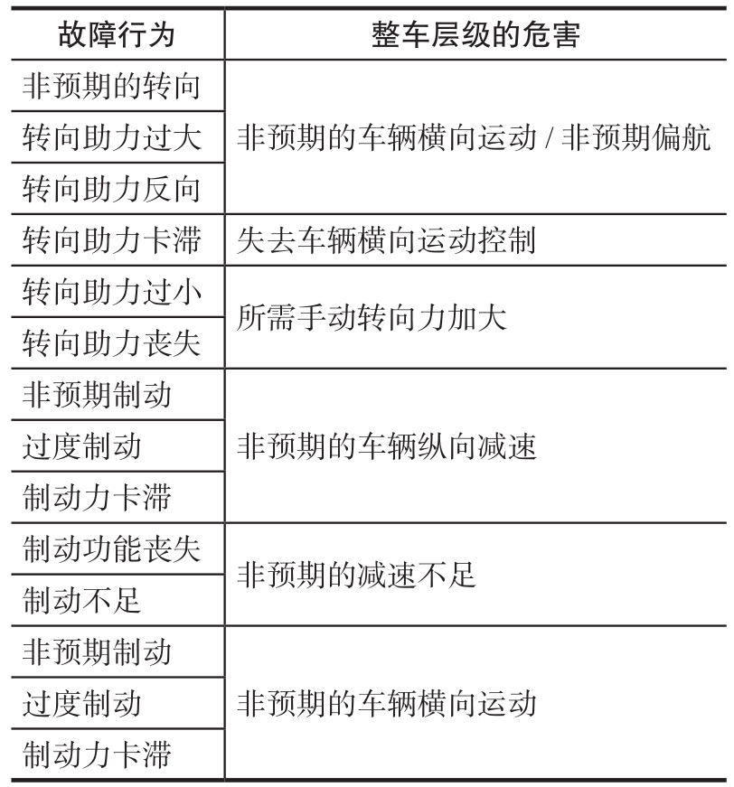 以上转向辅助功能和刹车控制功能异常可能导致的整车层级的危害如表3-2所示。