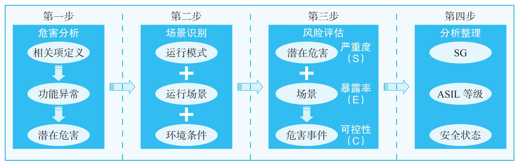从HARA的中文名称“危害分析及风险评估”可以看出,HARA活动由两部分组成:首先进行“危害分析”,然后进行“风险评估”。我将HARA活动归纳为以下几个步骤,简称“HARA四步法”,如图3-3所示。