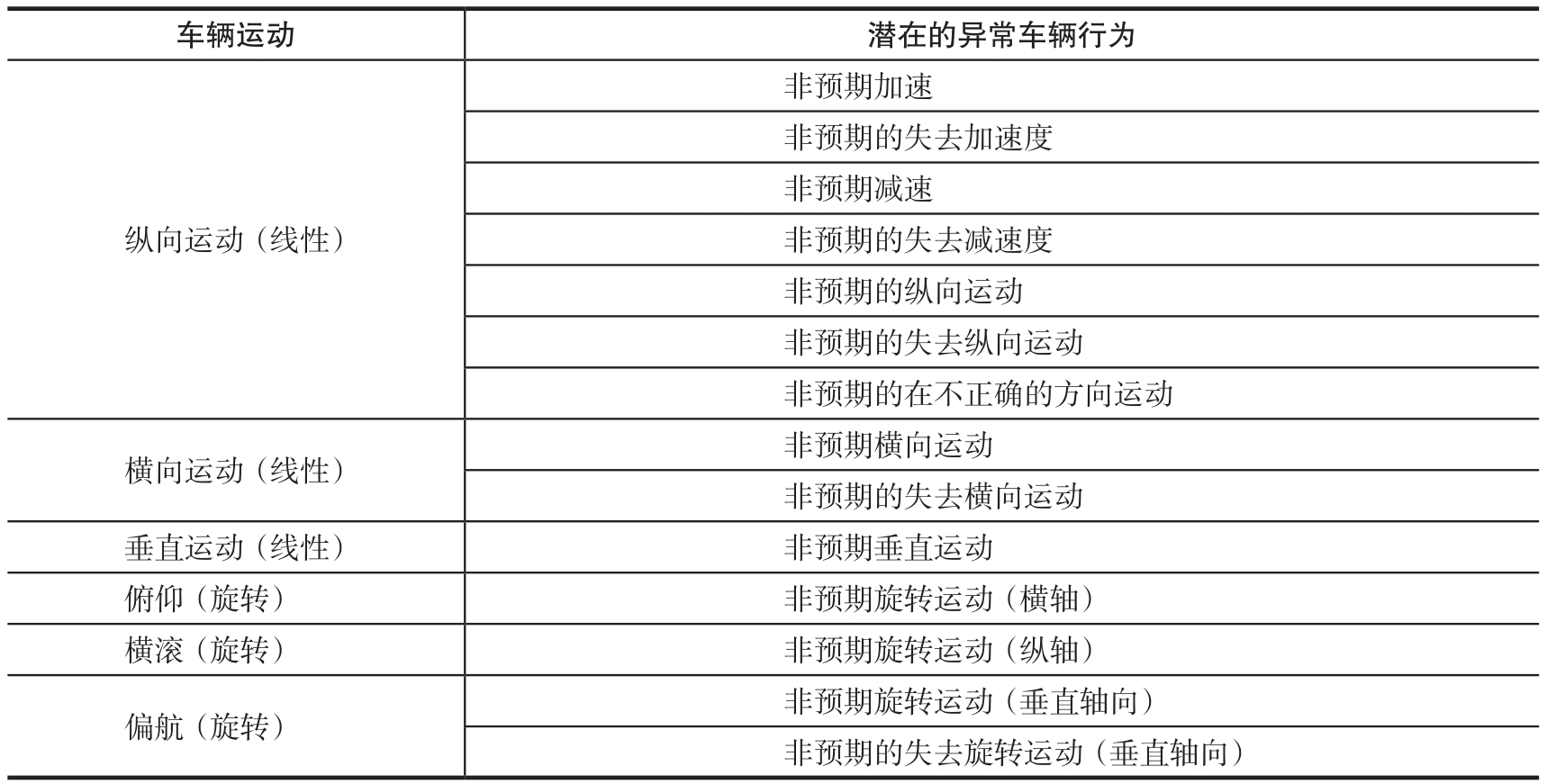 根据图3-4中的整车运动坐标系,表3-3列出了可能导致车辆沿轴线运动或绕轴线运动的相关项故障。该表可在HARA活动期间用于将相关项的危害与整车层级的危害事件对应起来。