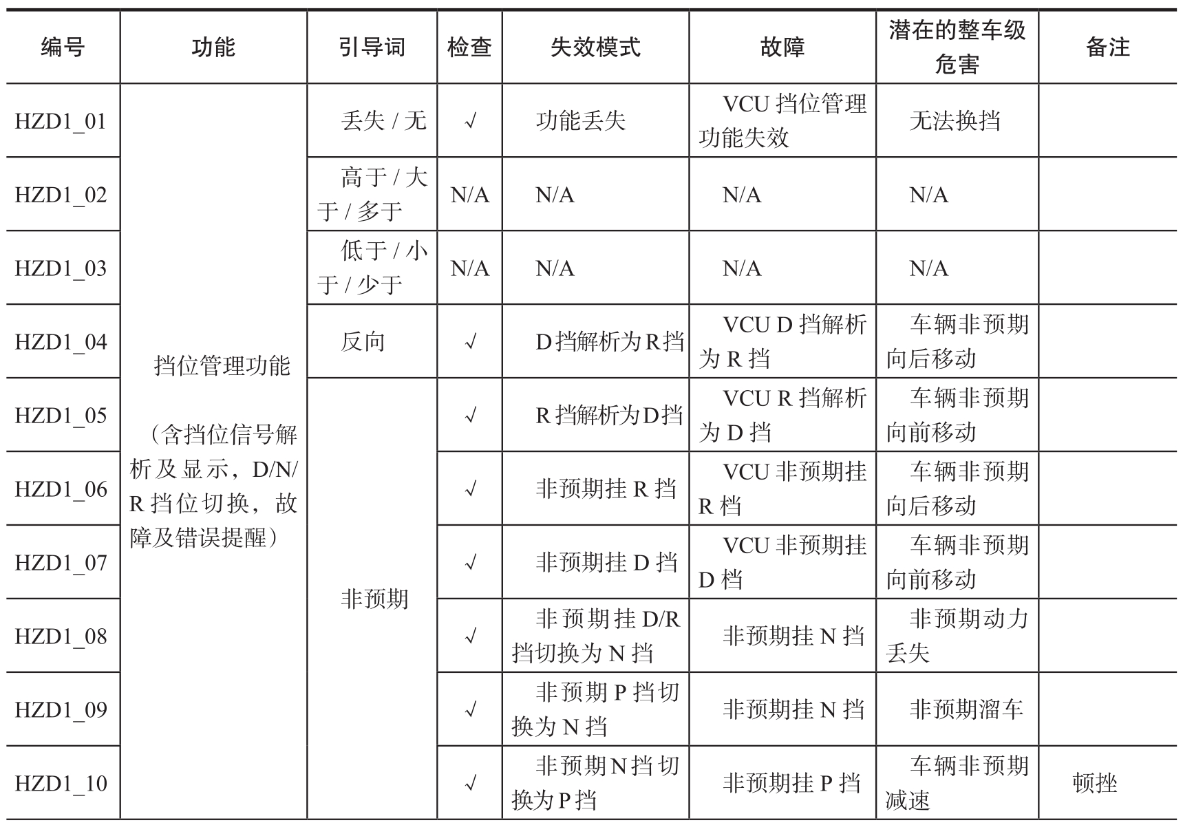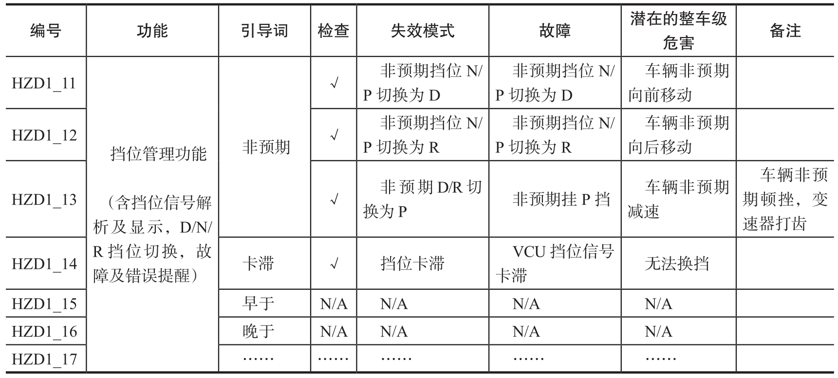 根据上述介绍,得出关于VCU挡位管理功能的HAZOP示例,如表3-4所示。