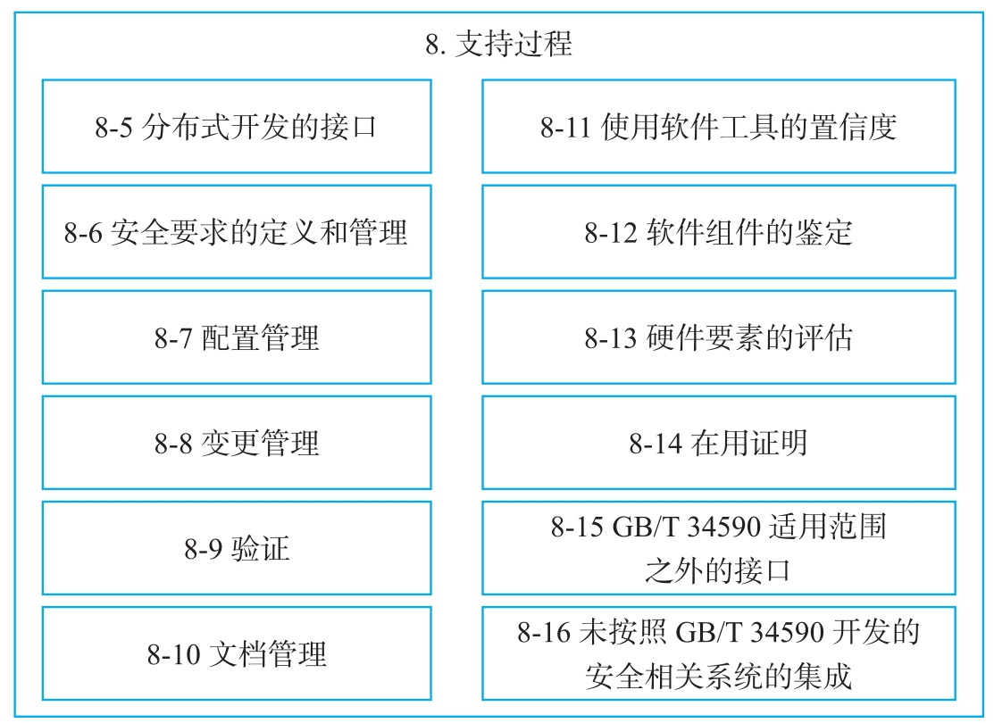 从第8部分的框架视图可以看出,支持过程贯穿整个功能安全开发生命周期。