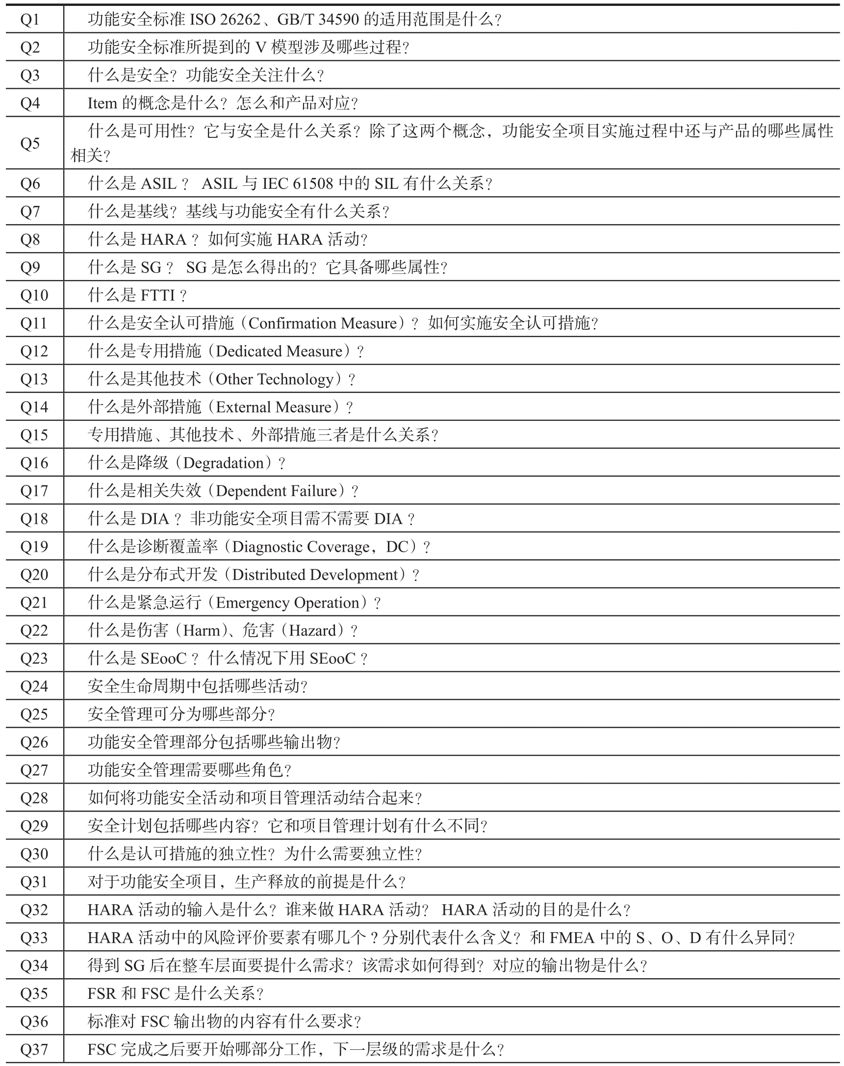 本章从一份问题清单开始,其中包含了标准各个部分相关的基础性问题以及实践过程中可能遇到的各种问题,旨在引导大家带着问题去阅读、思考和实践。这份清单可以说是一份进入功能安全标准的“入门考卷”。