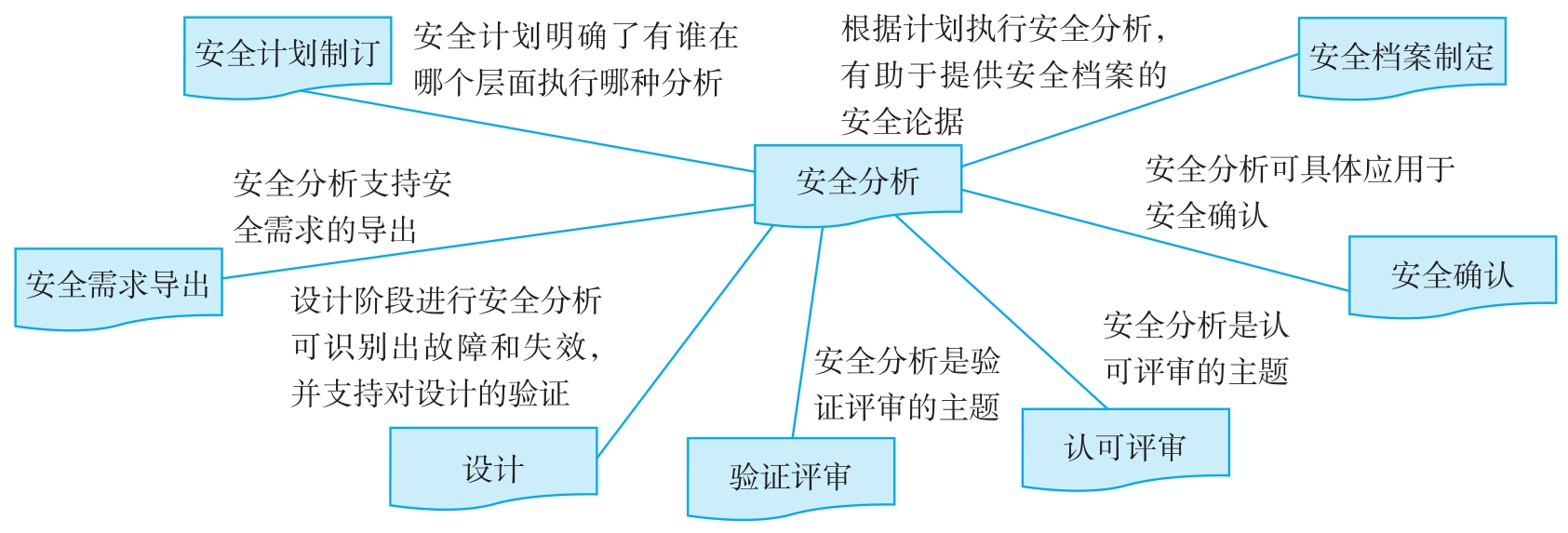 从上述各部分与第9部分的关联关系可以看出,安全分析是一项贯穿产品整个生命周期的活动,从概念阶段到报废阶段,都可以应用相关分析技术来提供活动实施依据。安全分析与其他活动之间的关系可参考图1-39。