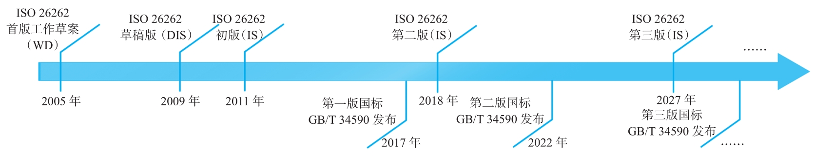 ISO 26262是一部应用于汽车领域的标准,其应用范围为量产乘用车上的包含一个或多个电子电气系统的与安全相关的系统,但不适用于特殊用途车辆上特定的电子电气系统,例如为残疾驾驶者设计的车辆。ISO 26262发展历程参见图1-5。
