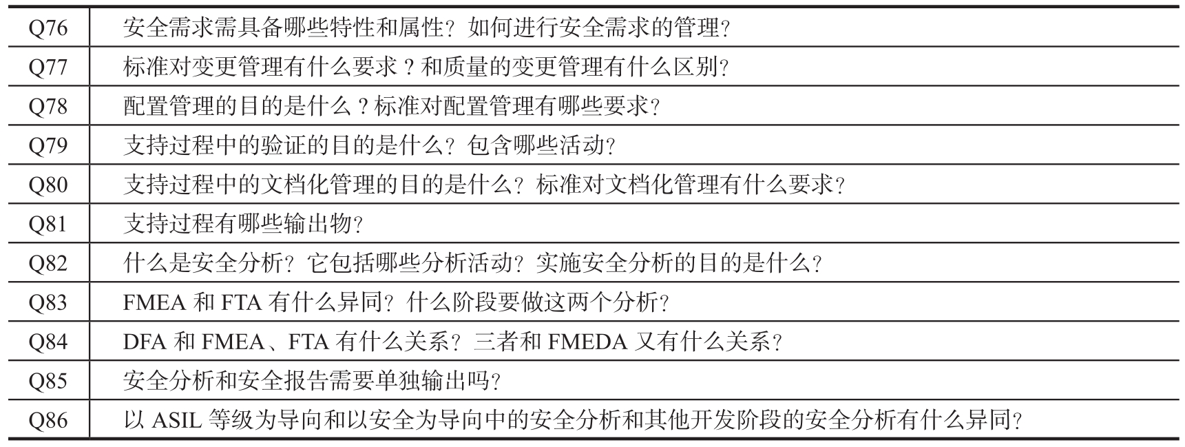 表1-1为一份关于功能安全标准内容的初阶问题清单。由于时间和能力有限,该问题清单并不能涵盖全部标准,权当用于引发思考。随着学习的持续和深入,本清单可用于粗略检视自身学习过程中的问题,也可用于交流探讨。希望该问题清单能不断扩展,逐渐深入。