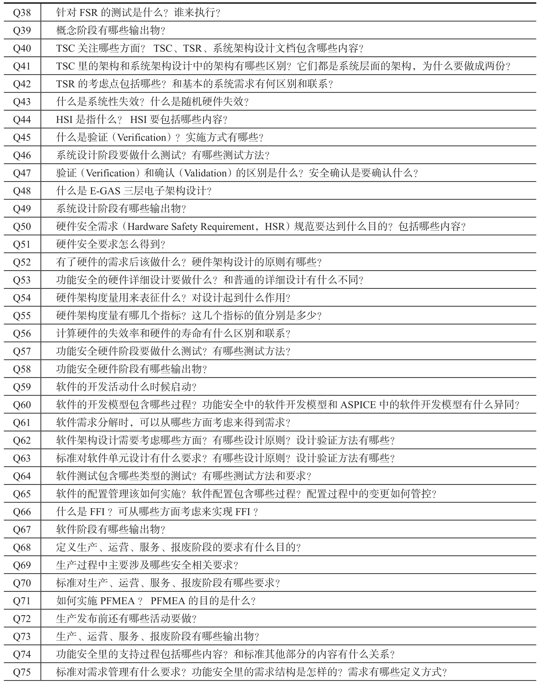 本章从一份问题清单开始,其中包含了标准各个部分相关的基础性问题以及实践过程中可能遇到的各种问题,旨在引导大家带着问题去阅读、思考和实践。这份清单可以说是一份进入功能安全标准的“入门考卷”。