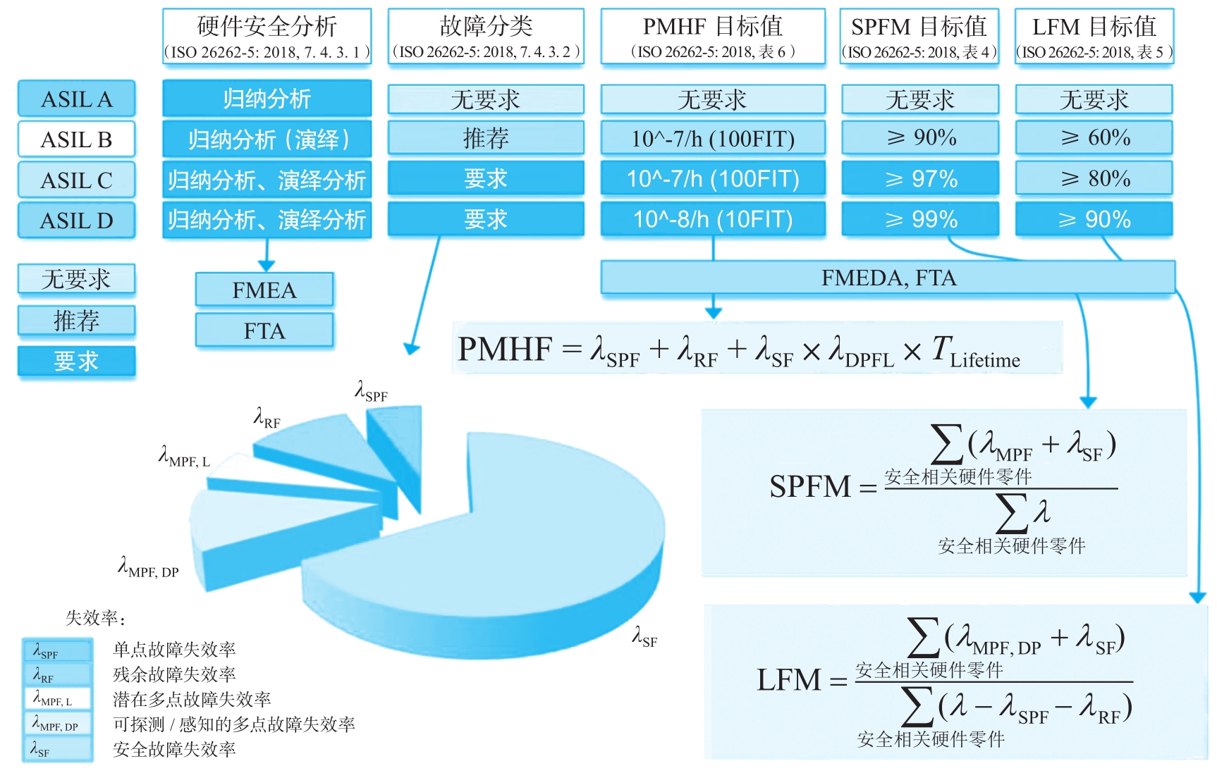 硬件部分一个非常重要的输出物是FMEDA分析报告,用于定量评估硬件架构的失效率是否满足对应ASIL等级的度量指标要求。硬件架构度量指标包含SPFM(单点故障度量)、LFM(潜在故障度量)、PMHF(随机硬件故障度量)。