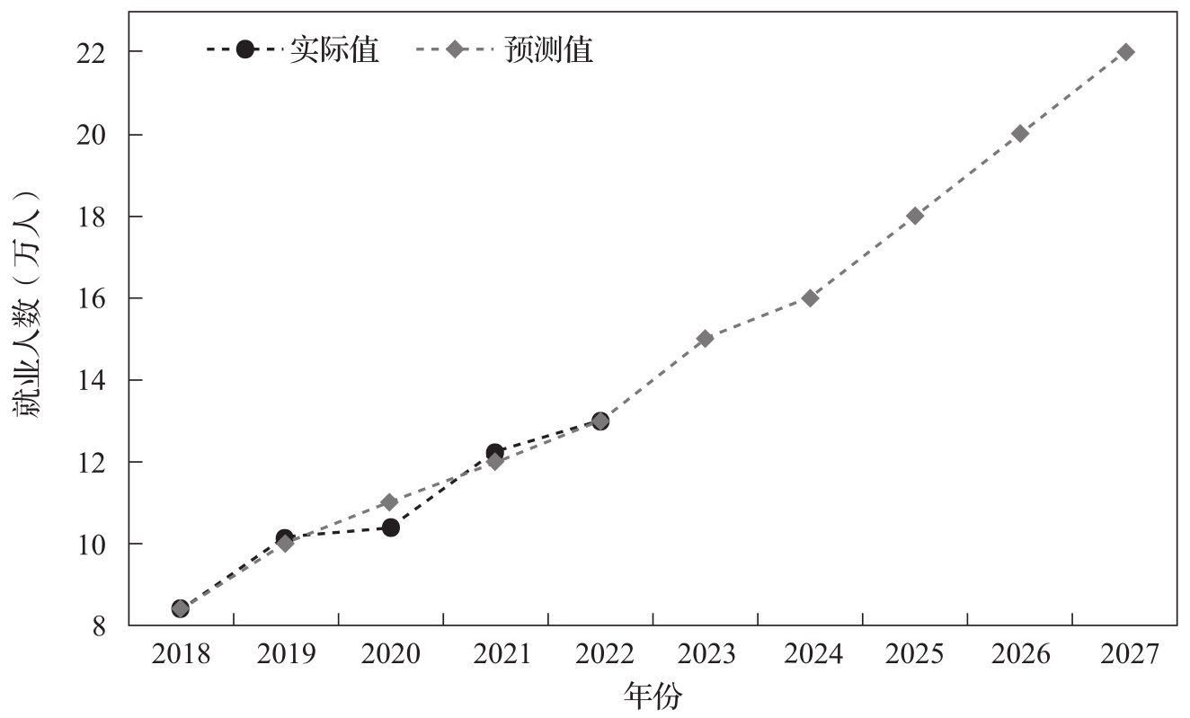 图3-5 河北省基于灰色预测模型的大数据产业人才需求的实际值与预测值