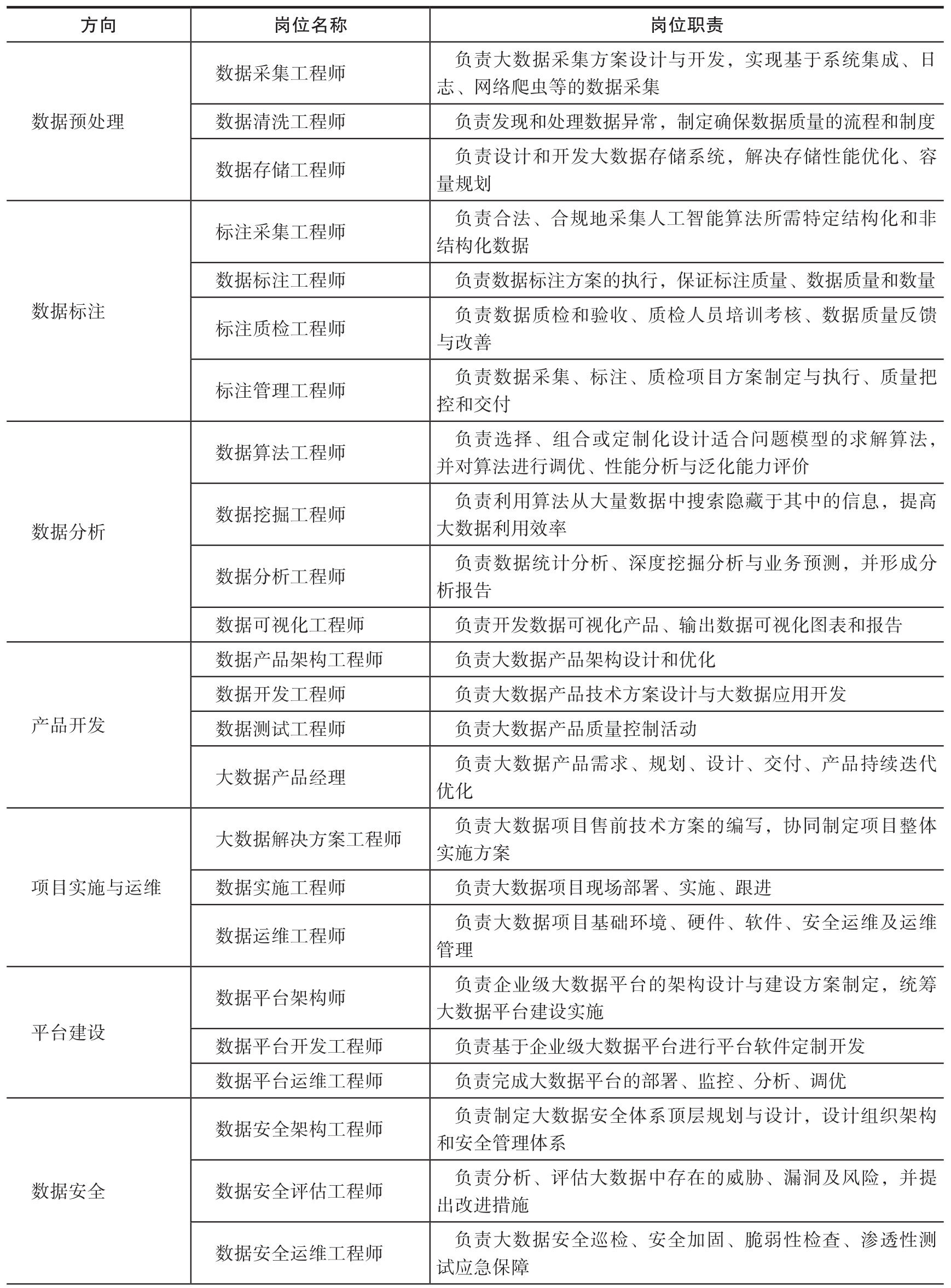 根据工业和信息化部发布的《大数据产业人才岗位能力要求》,大数据产业对人才需求围绕数据预处理、数据标注、数据分析、产品开发、项目实施与运维、平台建设、数据安全、数据管理、运营与应用、咨询服务等10个方向。具体岗位及职责如表3-1所示。