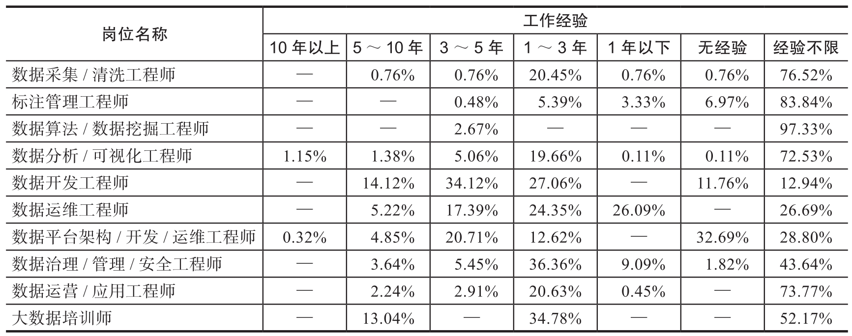 ● 仅数据采集/清洗工程师、数据算法/数据挖掘工程师、数据分析/可视化工程师、数据平台架构/开发/运维工程师和大数据培训师对硕士学历人才有需求,工作经验不限或无经验是企业招聘该类岗位的首选。