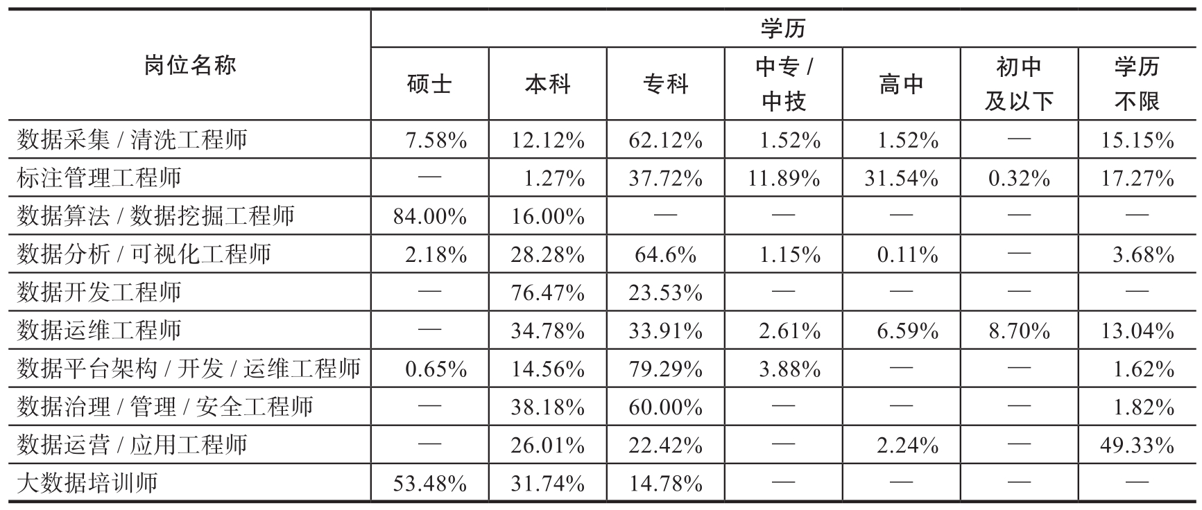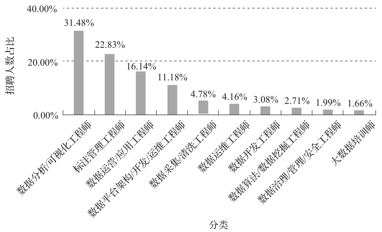 为保障数据采集的全面性、科学性及实践性,根据《中华人民共和国职业分类大典(2022年版)》,结合工业和信息化部发布的《大数据产业人才岗位能力要求》,以及智联招聘网站上的初步筛选,将信息传输、软件和信息技术服务中与大数据产业人才岗位有关的职业分为10类:数据采集/清洗工程师、标注管理工程师、数据算法/数据挖掘工程师、数据分析/可视化工程师、数据开发工程师、数据运维工程师、数据平台架构/开发/运维工程师、数据治理/管理/安全工程师、数据运营/应用工程师、大数据培训师。