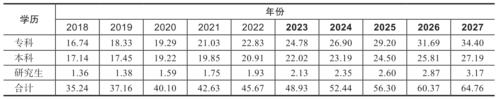 根据教育部、河北省统计局统计年鉴以及河北省国民经济和社会发展统计公报数据,获得2018—2022年河北省普通高等学校本专科全日制毕业生、研究生毕业生数据。然后,测算2023—2027年的毕业生数据,结果如表3-6所示。