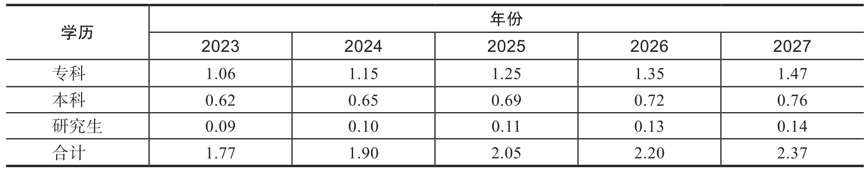 将表3-7所得数据与表3-6所得预测数据相结合,对2023—2027年大数据产业相关专业的毕业生人数及各学历层次人员需求进行测算,结果如表3-8所示。
