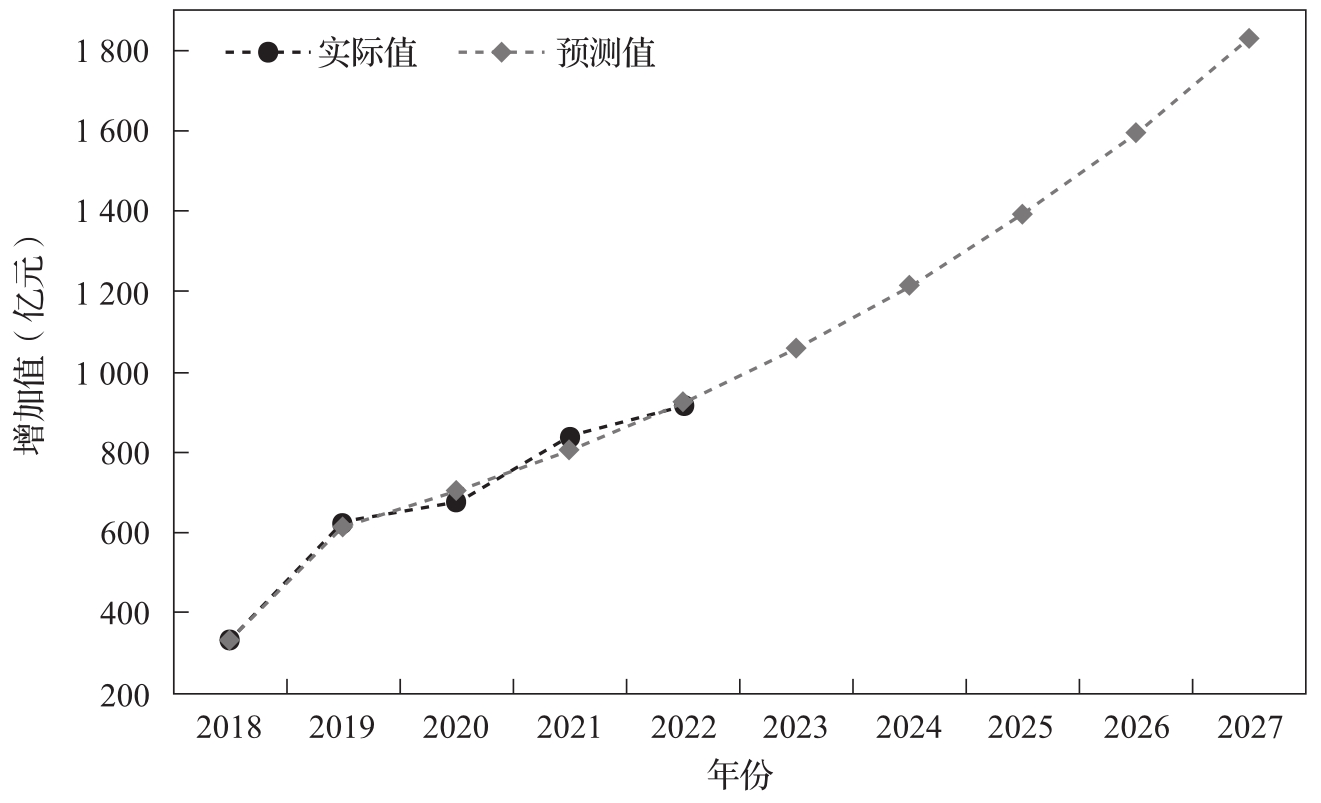 图3-4 河北省基于灰色预测模型的大数据产业增加值的实际值与预测值