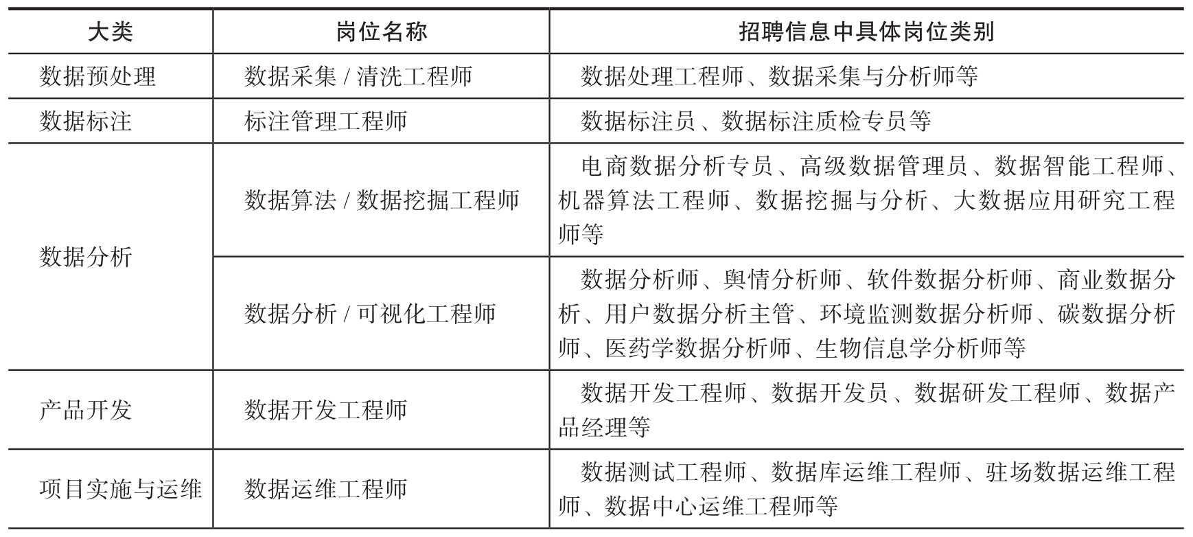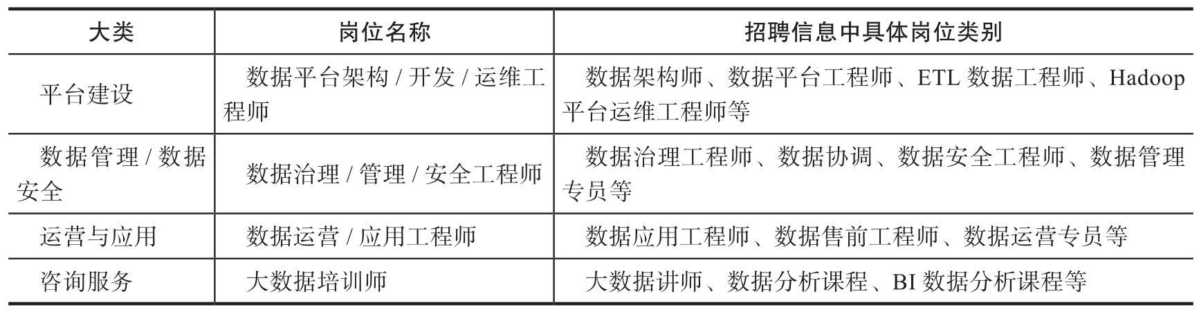 表3-1 大数据产业涉及的具体岗位及职责