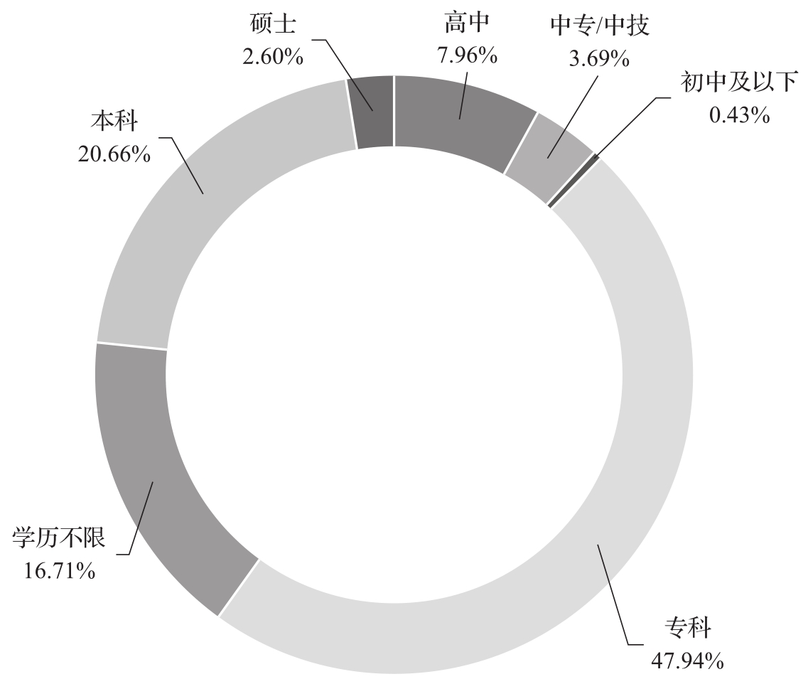 [摘 要] 本文运用网络调查法对2023年7月河北省的500余条招聘信息进行搜集,分析招聘单位对大数据人才需求学历和工作经验的要求,结合河北省国民经济和社会发展统计公报与河北省统计局统计年鉴,分析大数据产业总体人才需求情况。研究结果表明:本科及专科学历在招聘需求中占比最高,分别为20.66%、47.94%;工作经验不限是用人单位招聘该类岗位的首选;河北省院校毕业的大数据人才数量无法满足本省旺盛的产业人才需求。