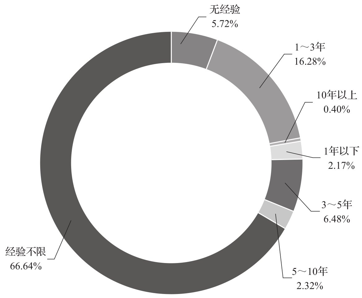 图3-2、图3-3分别为河北省大数据人才岗位对学历、工作经验的需求情况汇总。总的来说,本科及专科学历在人才需求中占比最高,分别为20.66%、47.94%;由于人才需求量大,因此工作经验不限是企业招聘该类岗位的首选。