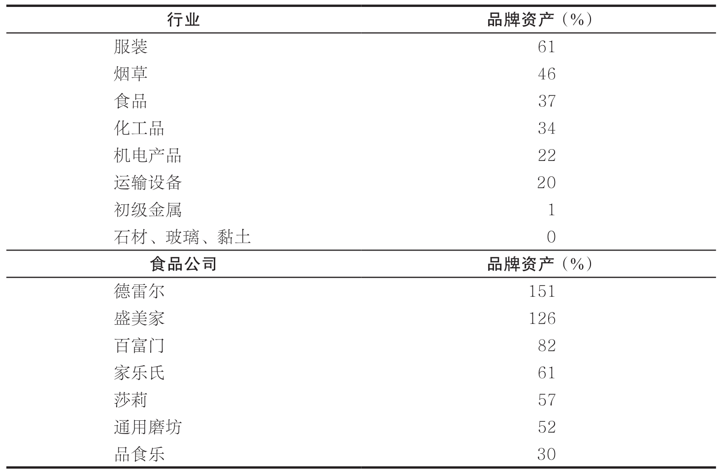 表1-1为不同行业品牌资产的平均值,以公司有形资产百分比表示,数据源于638家公司在1985年的数据。正如所预期的那样,初级金属、建材等行业的品牌资产微不足道,而服装、烟草业的公司却有着巨大的品牌资产。我们再具体到公司层面来看,德雷尔冰激凌(Dreyers Ice Cream)[美国东部市场采用埃迪(Edy)这一名称]、盛美家(Smucker)拥有相对于有形资产价值水平较高的品牌资产,虽然品食乐(Pillsbury)的品牌资产价值相对较低,但也是非常庞大的。