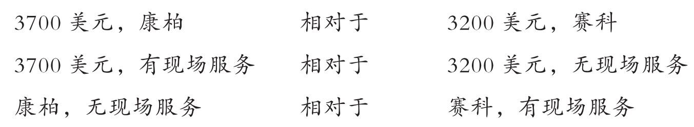 第二种方法是取舍分析法(也称为联合分析法)。在这种方法下,调查对象需要对品牌的特征进行取舍判断。例如,假设电脑的特征包括现场服务(提供、不提供)、价格(3200美元、3700美元)、名称[康柏、赛科(Circle)],有的调查对象可能会选择有现场服务、价位低、知名品牌的电脑。要确定各项特征的相对价值,调查对象需要进行如下选择: