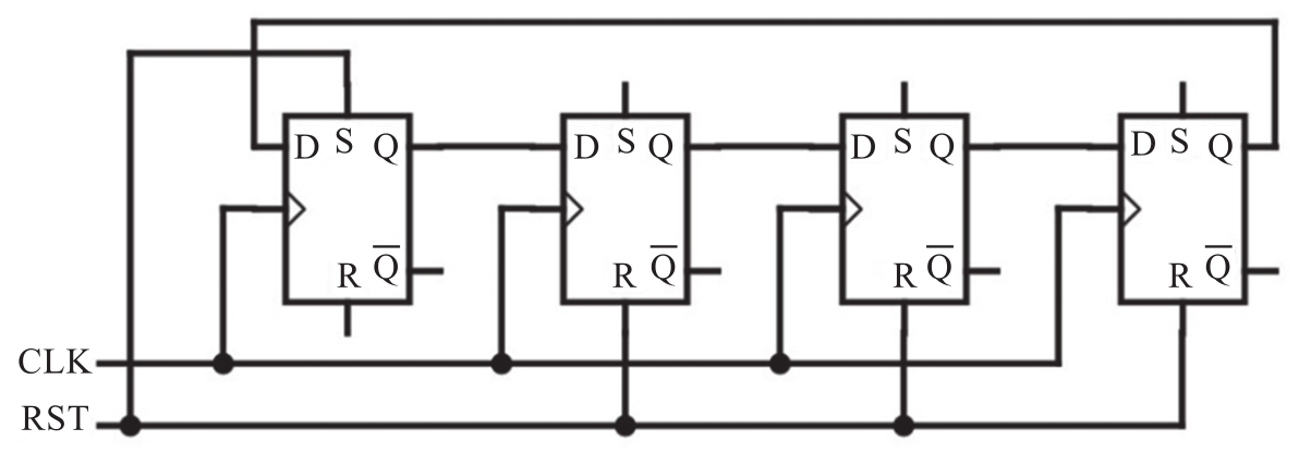 如果移位寄存器末端的输出Q连接到另一端的输入D,则构成环形计数器。环形计数器用于构建有限状态机等任务。有限状态机实现的数学模型总是处于一组定义好的状态中。当输入满足转换到不同状态的条件时,就会发生状态之间的转换。