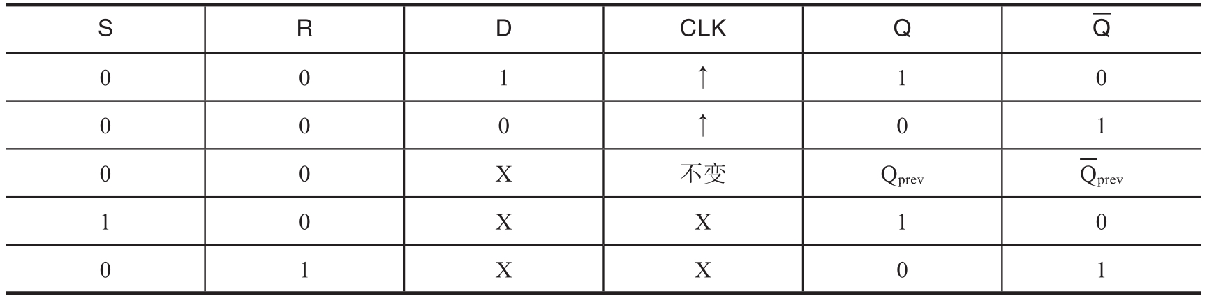 如表2.8所示。CLK列中的向上箭头表示时钟信号的上升沿。表2.8中,如果某一行中的时钟为上升沿,则这一行中的Q和