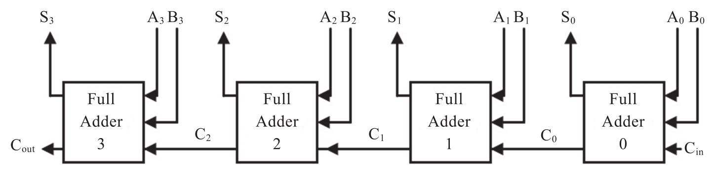 图2.15中的电路可以简要地使用具有三个输入和两个输出的框图来表示,以进行更高层次的抽象。图2.16是由4个图2.15所示的全加器电路构成的4位加法器。输入是要相加的两个数据A 0 ~A 3 和B 0 ~B 3 ,以及进位输入C in ,输出是和S 0 ~S 3 与进位输出C out 。