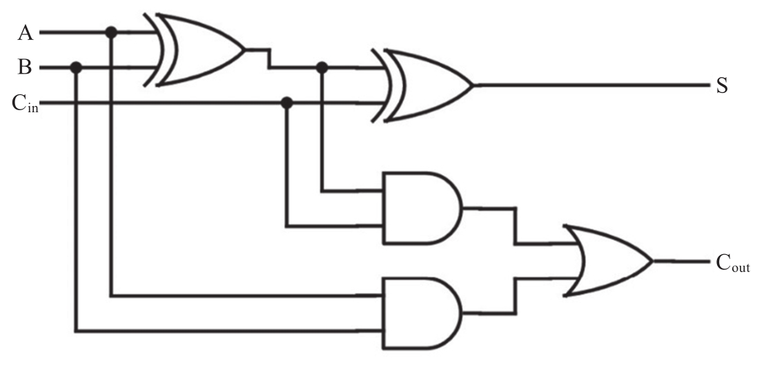 全加器使用逻辑门产生输出,其计算规则为:仅当A、B、C in 三个值中为1的总数为奇数时,结果位S才为1;否则,S为0。使用两个异或门执行该逻辑操作。如果A和B都是1,或者A和B中只有一个是1并且C in 也是1,则C out 为1;否则,C out 为0。