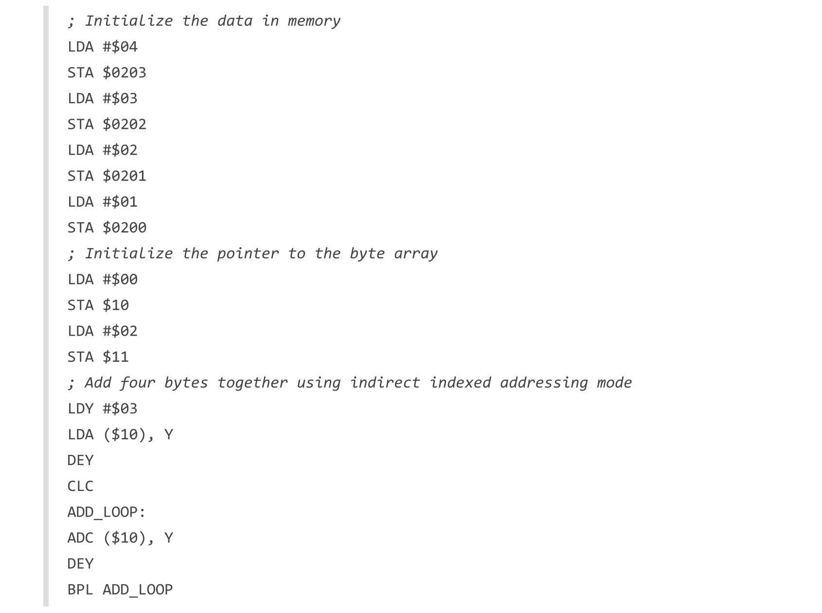 间接索引寻址方式 (indirect indexed addressing mode)使用存储在内存地址范围$00~$FF中的两个字节作为基地址,并将Y寄存器的内容与该基地址相加,从而生成指令所需的内存地址。在下面的示例中,首先将字节数组的基地址($0200)以小端模式存储在地址$0010和$0011处。该代码在循环体中使用间接索引寻址将字节相加: