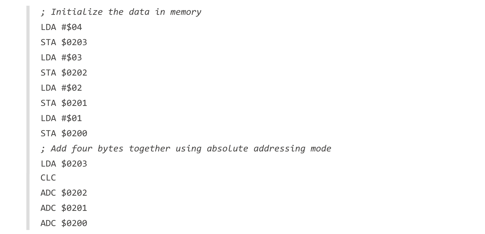 绝对寻址方式的示例中,开始是一段初始化代码,将4个字节存入地址为$200~$203的内存单元。接下来是实现4个字节相加的代码。下面是用绝对寻址方式对4个字节进行求和的例子:
