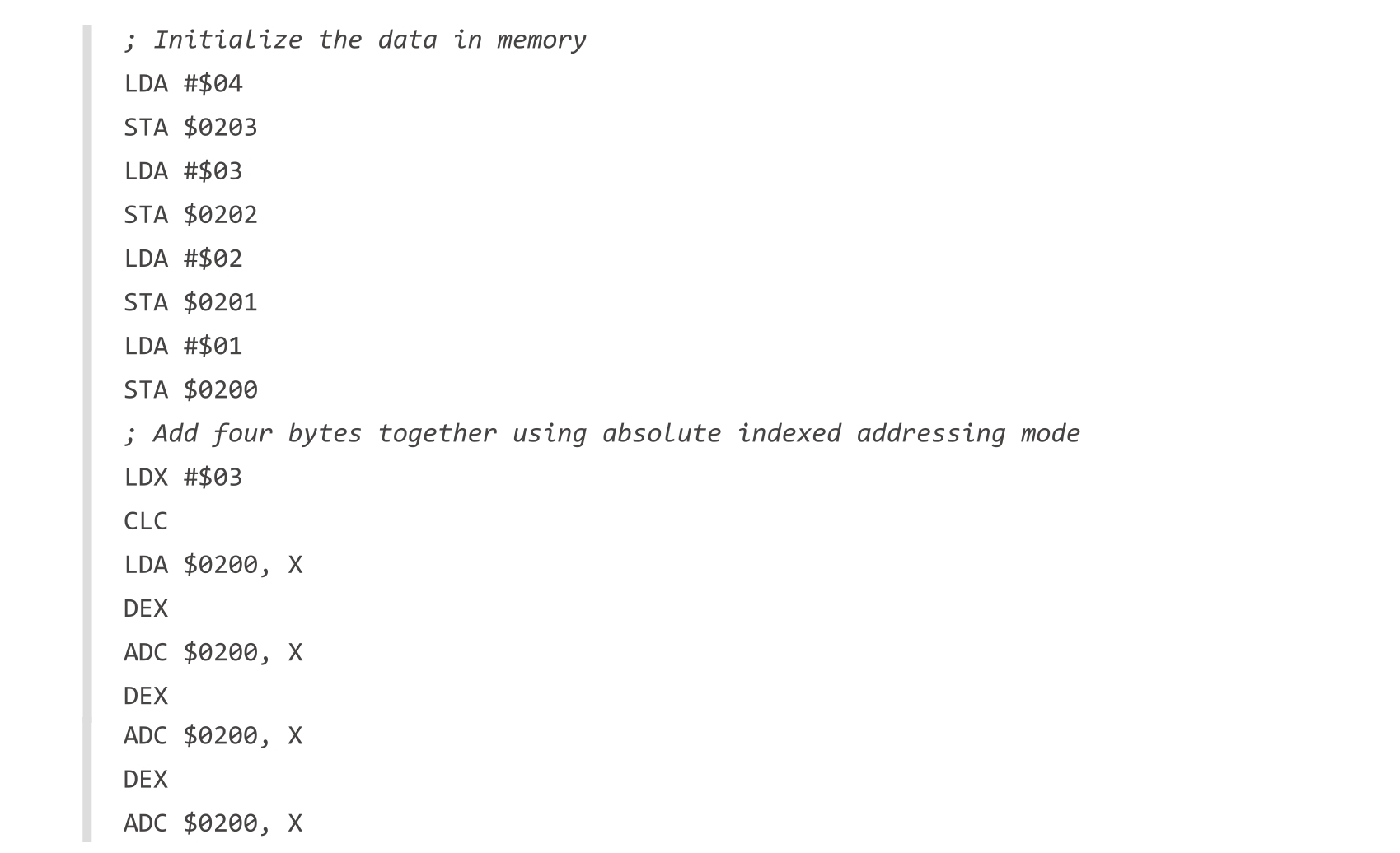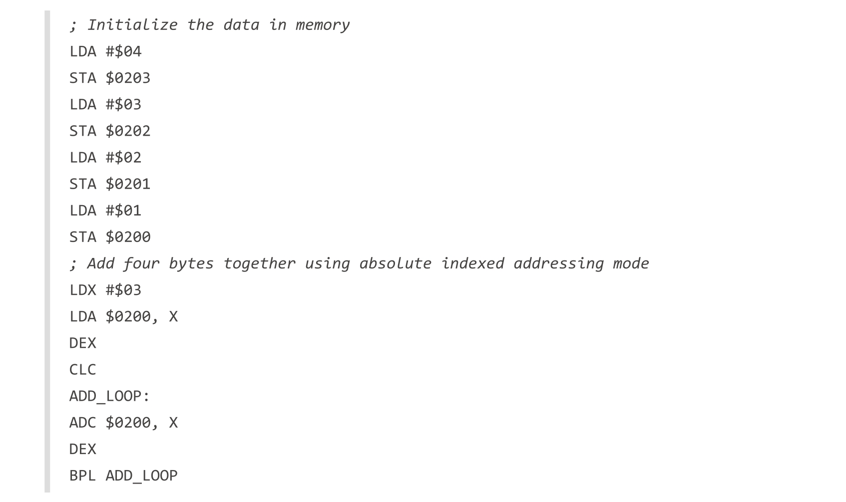 。以下示例用绝对索引寻址方式将地址$0200~$0203中的字节相加。X寄存器提供了相对于字节数组基地址$0200的偏移量: