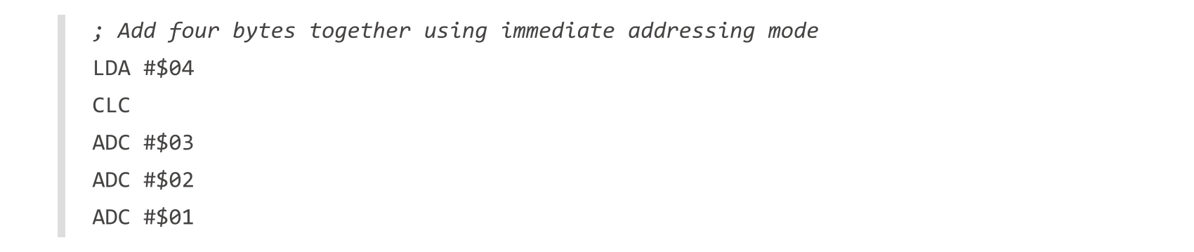 在立即寻址中,操作数的数值紧跟在内存中的操作码之后。在第一个示例中,假设给定了4个字节的值,要求编写6502程序来对这4个字节的数据求和,在程序代码中将直接使用这几个字节的值。本示例中的字节数据为$01~$04,此处将以相反的顺序($04~$01)将这4个字节相加,这样做的目的是便于在后面使用循环结构。下面的代码使用立即寻址方式将4个字节相加: