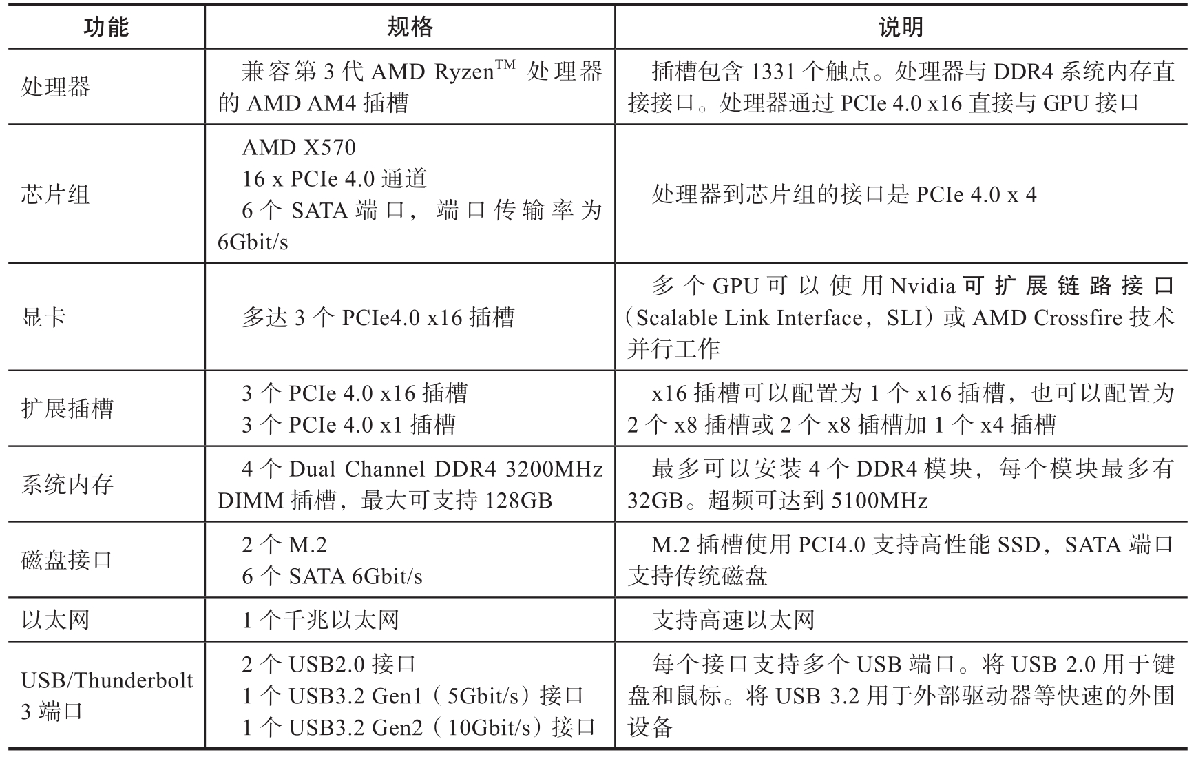表4.4所示是ASUS Prime X570-pro主板的设计,这是一款用于游戏应用的且支持超频(Overclocking)等游戏相关的技术的高性能主板。超频通过增加处理器和其他系统构件的时钟频率来提高性能。
