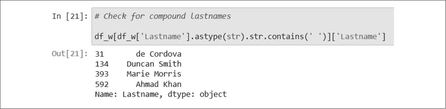 可以通过检查Lastname是否包含空格判断该方法的效果。图2-6显示了仍包含空格的剩余Lastname条目。