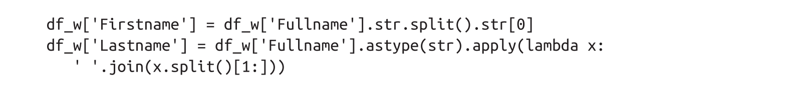 下一个任务是将Fullname列分为Firstname列和Lastname列,以便分别进行匹配。在本例中,我们使用一种简单的方法,即选择第一个子字符串作为Firstname,其余通过空格分隔的子字符串作为Lastname。