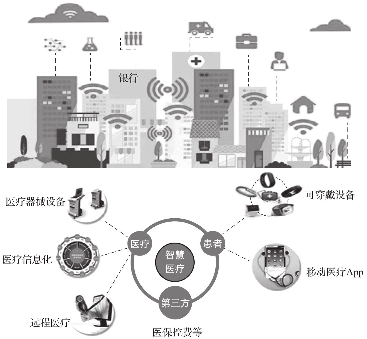 物联网技术与人工智能技术追求的是一个智能化生态体系,除技术上需要不断更新,技术的落地与应用更是现阶段物联网与人工智能领域亟待突破的核心问题 [ 5 ] 。一方面,通过物联网万物互联的超大规模数据可以为人工智能的深度洞察奠定基础,另一方面具备了深度学习(Deep Learning,DL)能力的人工智能又可以通过精确算法加速物联网行业应用落地。当物联网技术与人工智能技术融合后,物联网的潜力将得到更进一步释放,进而改变现有产业生态和经济格局,甚至是人类的生活模式。智能物联网将真正实现智能物联,也将促进人工智能向应用智能趋势发展。近几年国家加大对“智慧城市”“智慧医疗”(见图1.2)、“智慧社区”等智慧物联网应用落地项目的重视,与此同时安防市场对智能物联网技术的需求也在大量增加,相信智慧物联网技术将迎来一波新的热潮 [ 6 ] 。